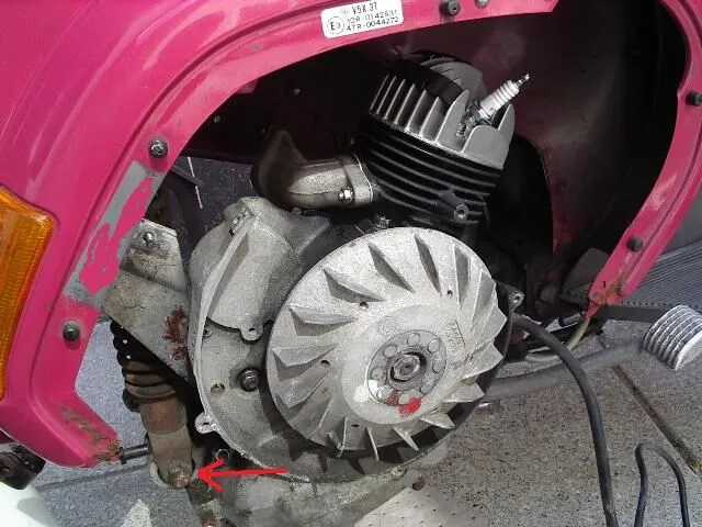 dann wird die schraube hinten am federbein abgeschraubt, aber vorsicht, der motor klappt nach unten und ist schwer