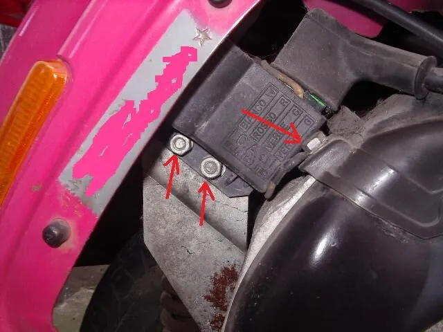 dann könnt ihr das rad abschrauben. dazu löst man nur die 5 schrauben (rote pfeile) der grüne pfeil zeigt die lage der schraube vom auspuff,