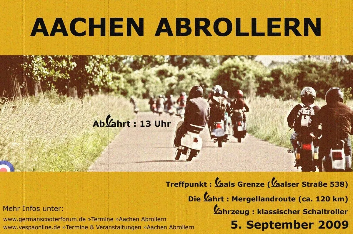 Am Samstag den 5. September 2009 in Aachen um 13 Uhr gehts wieder los! Das Abrollern wird ungefähr so sein wie das Anrollern in Mai. Nur diesmal wird es keine original 50er geben, da letztes mal keiner gekommen sind. Man sollte diesmal also mindesten 75cm³ haben.