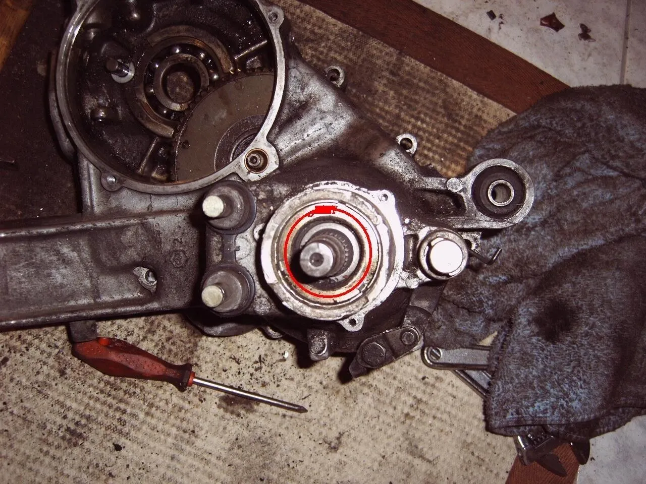 schau doch in eine Explosionszeichnung, da kann nichts passieren, das is meines wissens nur ein Blechkäfig mit einem Filzring. Welle mit einem Aludorn in Richtung Motor aus dem Lager treiben.