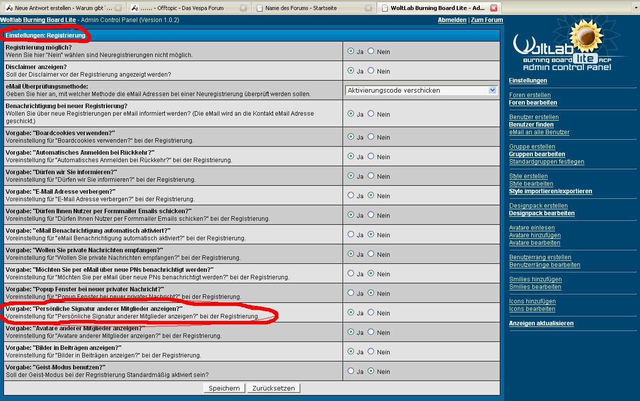 will oder nicht. Aber das ist nicht alles. Jede Einstellung die der User ändern kann kann der Admin als Standard setzen.Also mein Vorschlag aktiviere doch die Signatur setze aber die Einstellung der User ob die Sig. angezeit werden soll