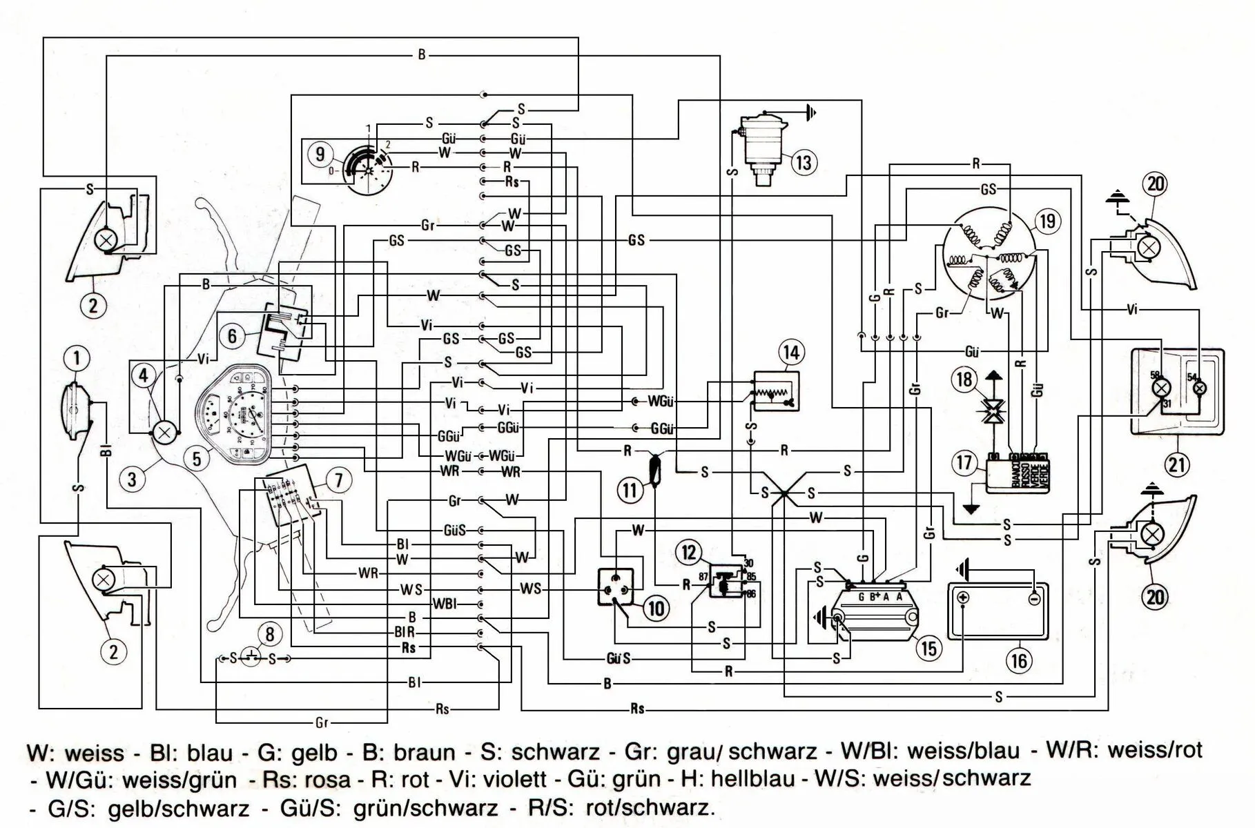 Ja das ist A, A =(Alternator 2 x; GG 2x = Generator das sind zwei verschiedene Bezeichnungen für das Gleiche ), frei (ist für weitere Spule), G (ground in der LIchtmaschine) B+ = Batterie plus, Masse. Allso aus der Lichtmaschine sollten drei Kabel kommen. Zwei GLEICHFARBIGE auf A,A das Dritte auf G. Was mich aber irritiert SCHWARZ ist bei Vespa normalerweise Strom +, Giebt es eventuell einen Roller mit Batterie? Dann sollte B+ zur Batterie gehen. Als Anhang den [lexicon='Schaltplan',''][/lexicon] einer PK50XL2 E-Starter (mit Batterie).