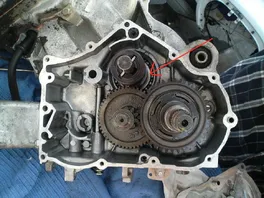 Ich glaube das brauchst Du nicht. Hier mal ein Bild wie das von innen ausschaut. Der Pfeil zeigt auf den Seegerring der die Welle an der richtigen Position halten soll. Bevor Du jetzt das Getriebe aufmachst, schraub mal die Verkleidung des Keilriemens ab, und schau mal ob Du das Rad achsial 8rein raus) bewegen kannst.