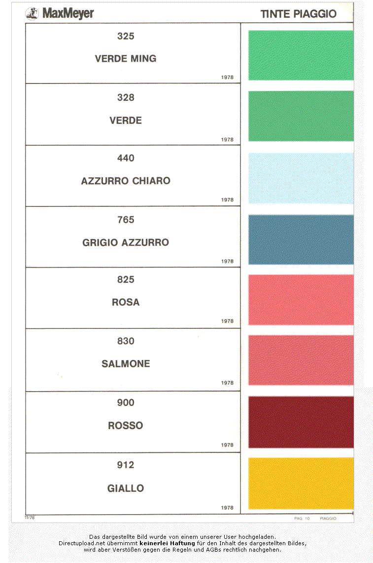 Letzte Klarheit könnte der Topiceröffner mit seiner Originalbetriebserlaubnis (falls vorhanden) schaffen - am oberen Rand der 1. Seite steht "Nichtamtliche Eintragungen", dahinter dann eine 6-stellige Zahlenkombination. Die ersten 3 Ziffern stehen für die Bestellnummer des Fahrzeugs lt. damaliger Preisliste, die letzten 3 für die Farbnummer.