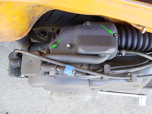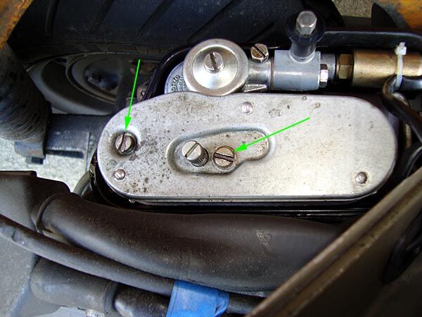 Dann müsstest Du die Aufnahme vom Gaszug eigentlich schon sehen, kannst natürlich auch noch die beiden markerten Schrauben lösen und den Luftfilter abnehmen. Dann sieht die Sache so aus: