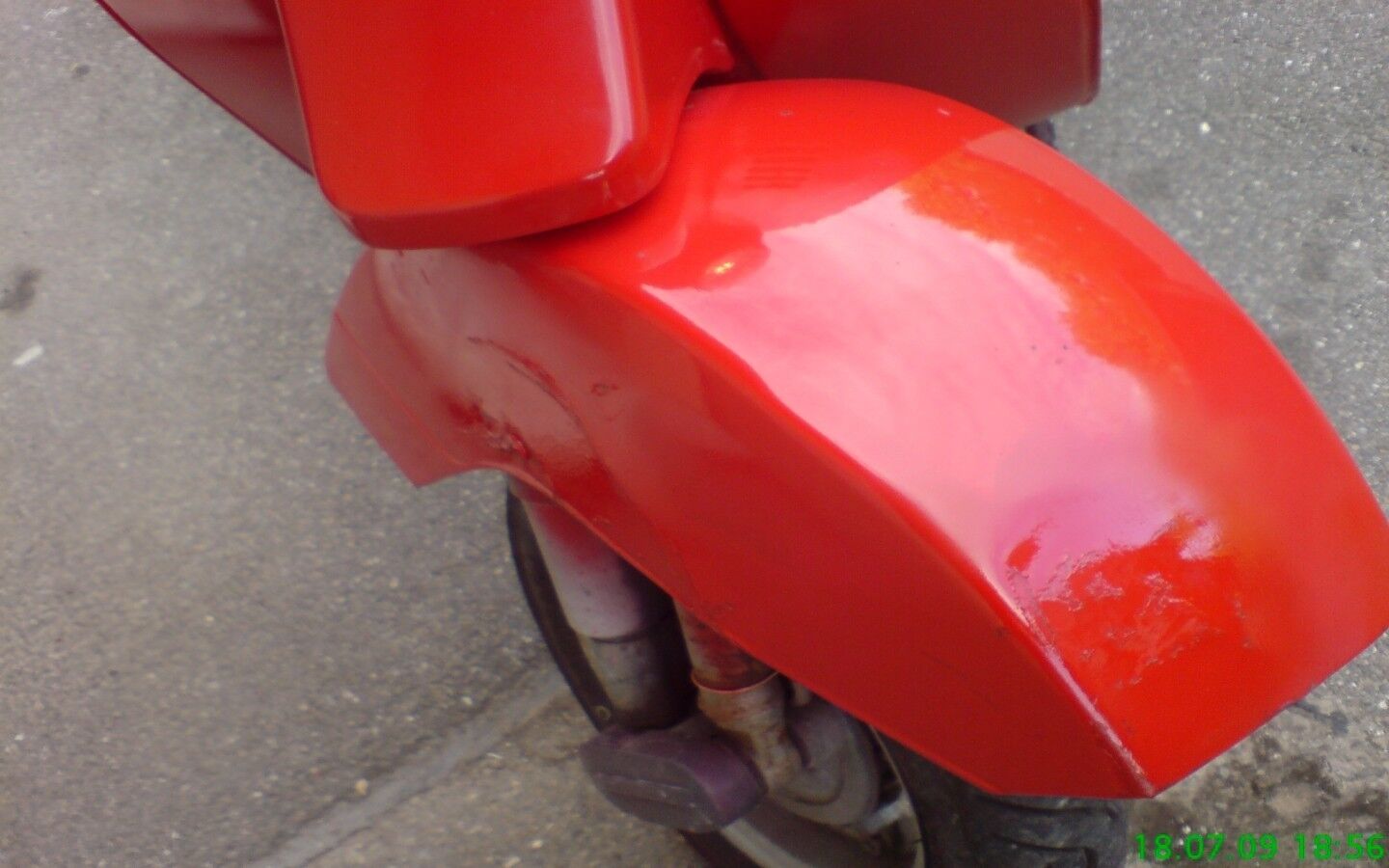 Beinschild war mal verbeult, ist wieder gerichtet, Schutzblech ist verbeult.
