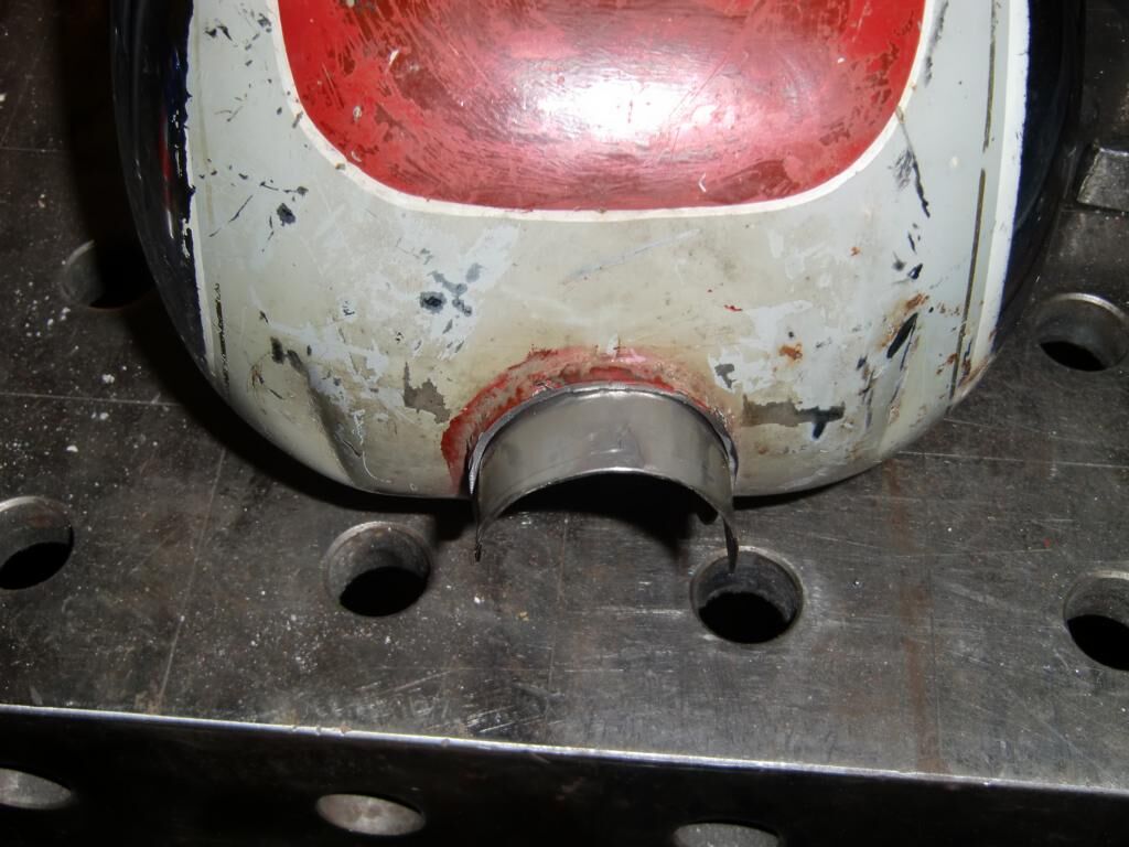 wenn du (auf dem bild mit dem tank von vorne gesehen) eine halbrunde lasche an den tank schweißt und die dann mit schrauben auf dem rohr fest machst?
