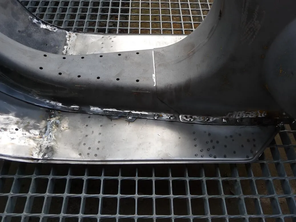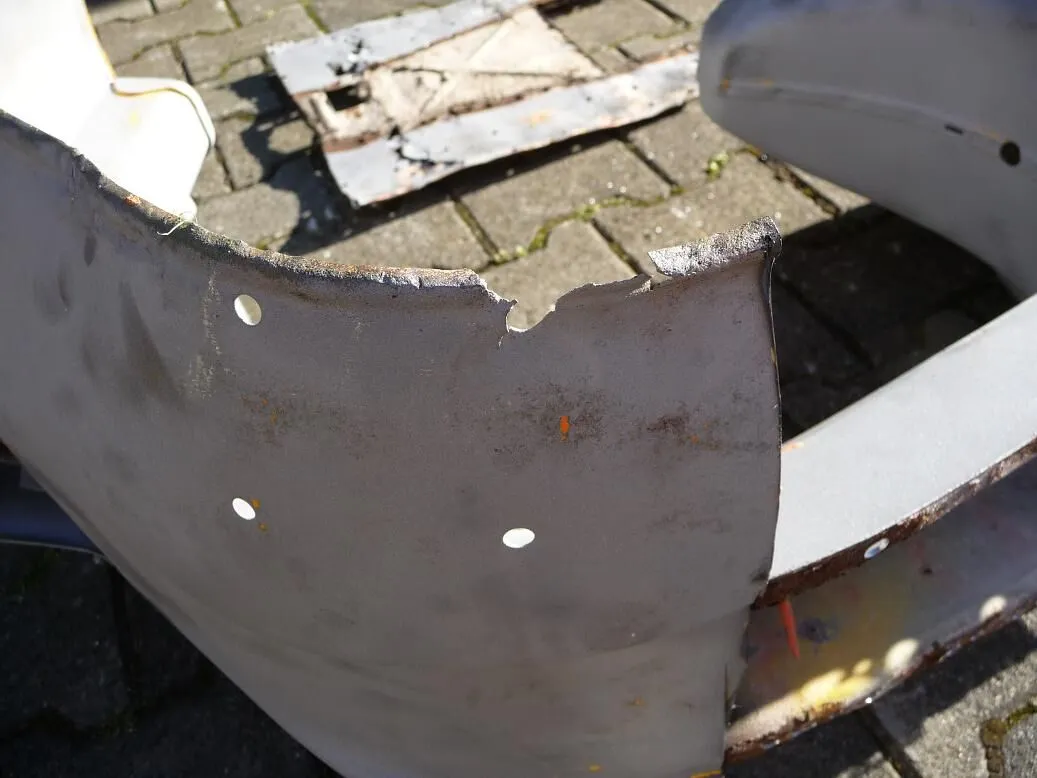 Jetzt das nächste Problem. Wie bekomm ich das Beinblech wieder sauber hin? Am Bild ist eigentlich die schlimmste Stelle. Sonst nur Risse bzw. keine schöne Kante mehr.