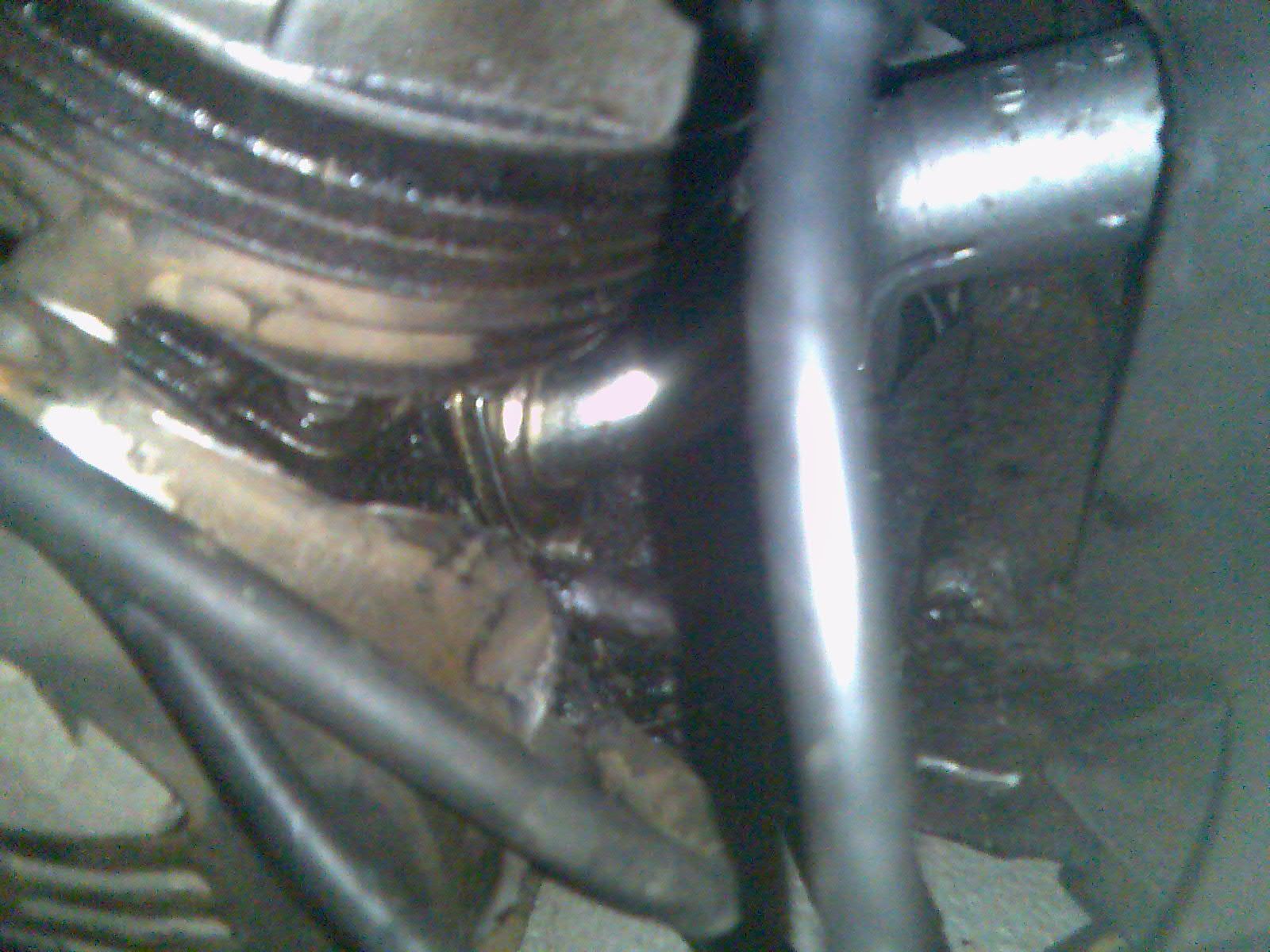 Hier ist mal ein Foto von der Stelle aus der eine schwarze ölige Flüssigkeit austritt aber nur wenn der Motor am laufen ist.Kann mir bitte jemand helfen was da undicht ist .