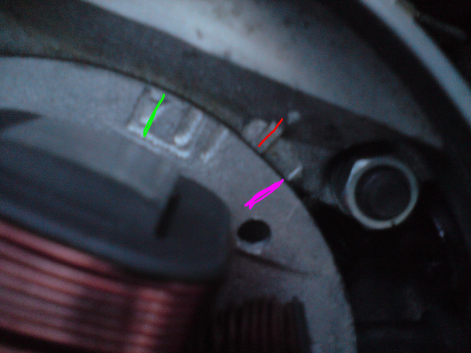 Neiiiin, wenn du von grün auf pink drehst dann drehst du ja gegen den Uhrzeigersinn also auf mehr Vorzündung. Das Bild von Oncho ist so gemeint: In der Stellung wie abgebildet steht es auf 19° vor OT und das rote ist die Markierung am Motorgehäuse. Wenn du jetzt grün auf rot drehst, also im Uhrzeigersinn, hast du weniger Vorzündung. Auf dem Bild sind das natürlich deutlich über 2°.