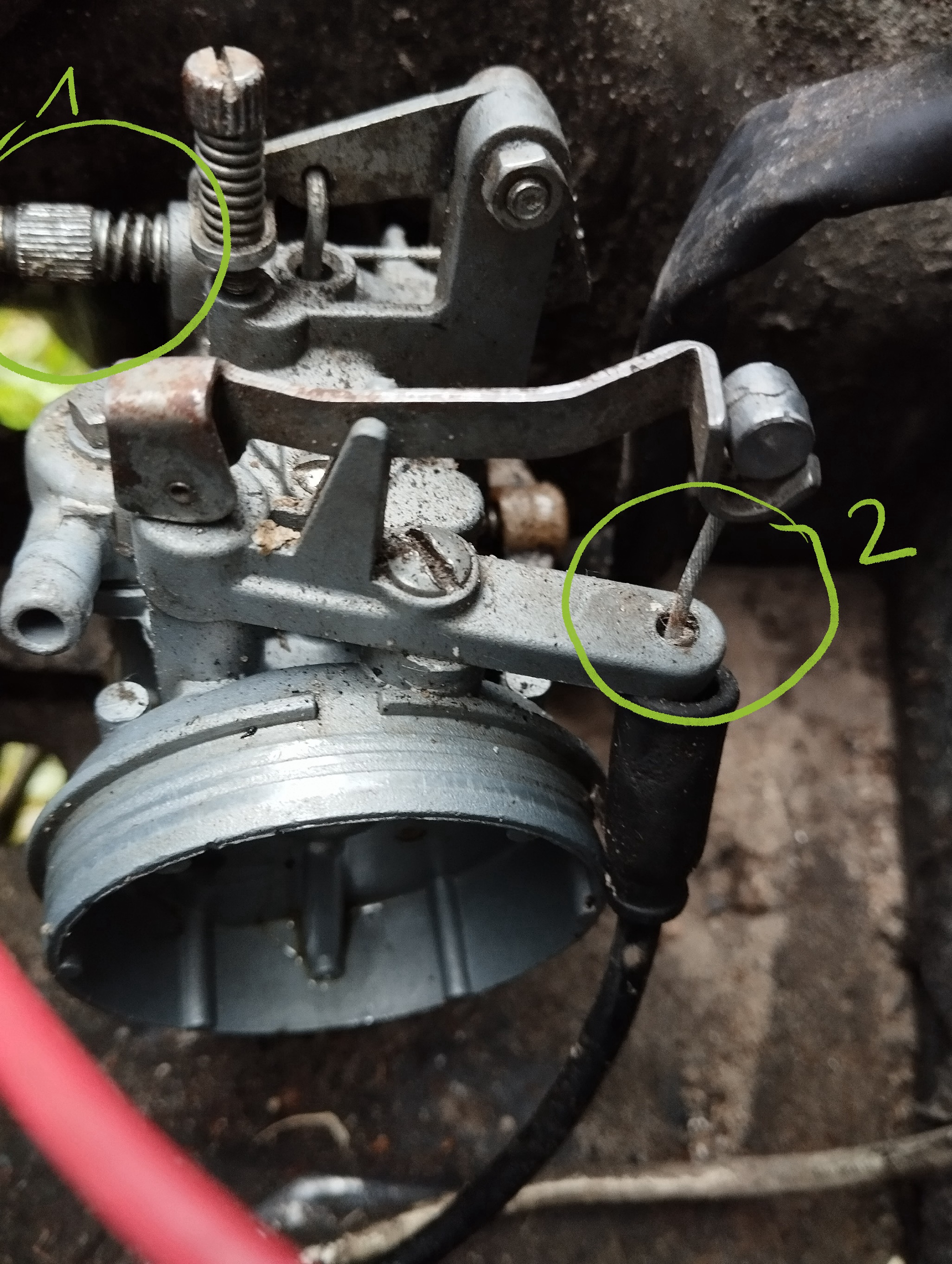 • Zu 1: das ist der Gaszug -> Hebel ziehen, Gaszug aus dem Hebel aushängen und durch die Schraube ziehen.