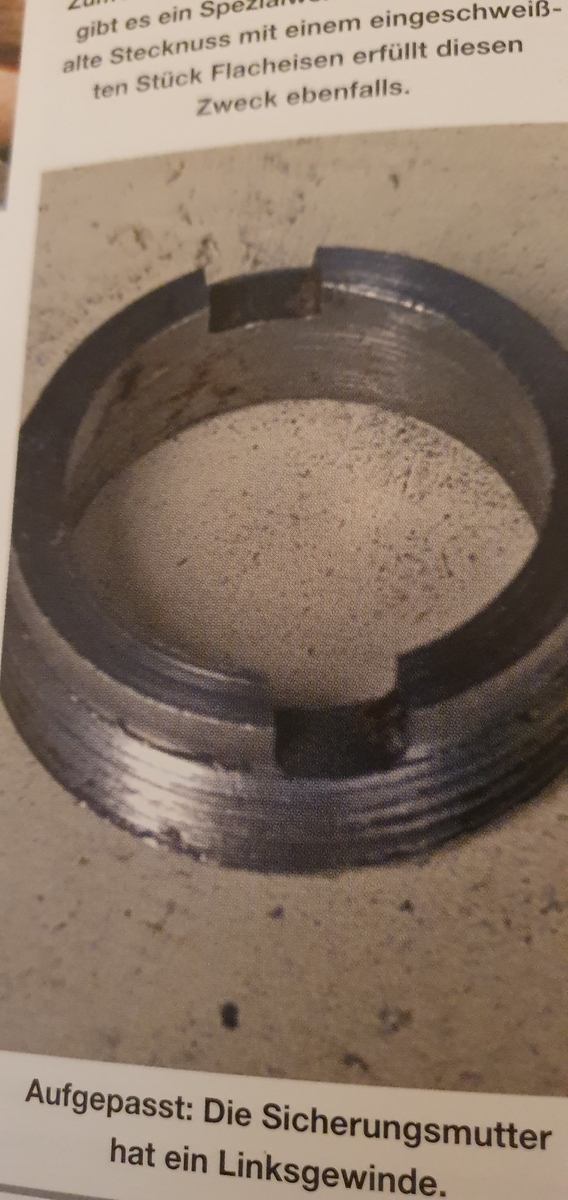 Bevor Du eine neue Welle kaufst, kannst dir aber 2 neue Muttern besorgen, eine davon mit einem Sägeblatt (Puck Säge) längst Kerpen einschneiden(Foto folgt) diese Mutter dann mit WD40 und immer wieder hin und her Bewegungen das Gewinde nachschneiden und damit das Gewinde zu 90% retten!