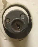 Das runde Metallteil oben drauf ist mit den beiden Klemmnägeln fest. Das mußt du vorsichtig abhebeln. Dann kannst du das Schloß rausnehmen. Das Metallteil verhindert das die das Schloß jedes mal wenn du es schließt rausspringt.