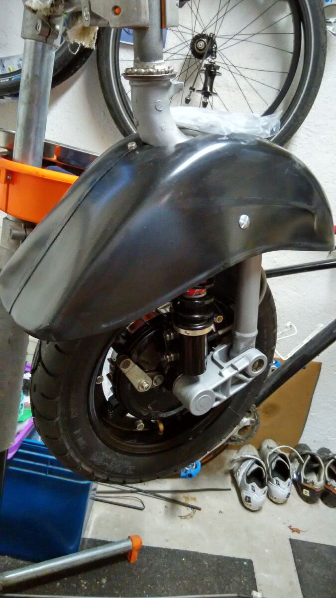 Habe nur Bilder mit Probezusammenbau mit zusammengegimpter Karosserie, eingebauten Motor und Gabel. Untergestellte Kiste hat genau die Höhe vom Ständer. Kotflügeladapter wurden anschliesend vorn noch in der Höhe gekürzt.