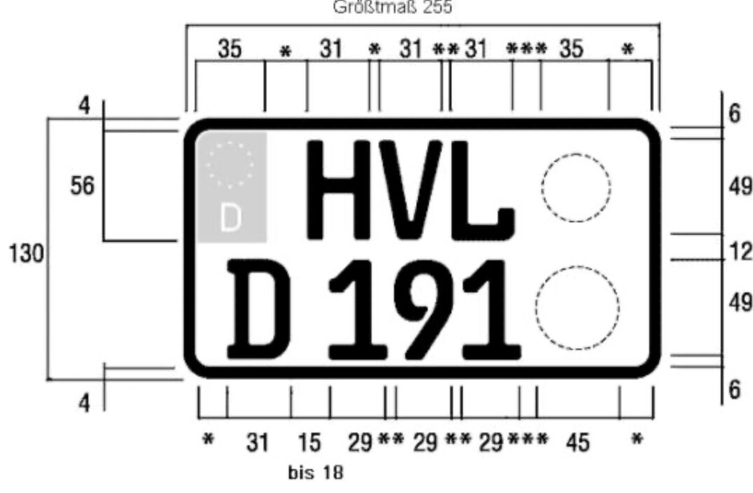 Ich habe meine 125er PK heute angemeldet. 180x200 mm, kleinstmögliche Motorradgröße. War auch beim Vorbesitzer so.