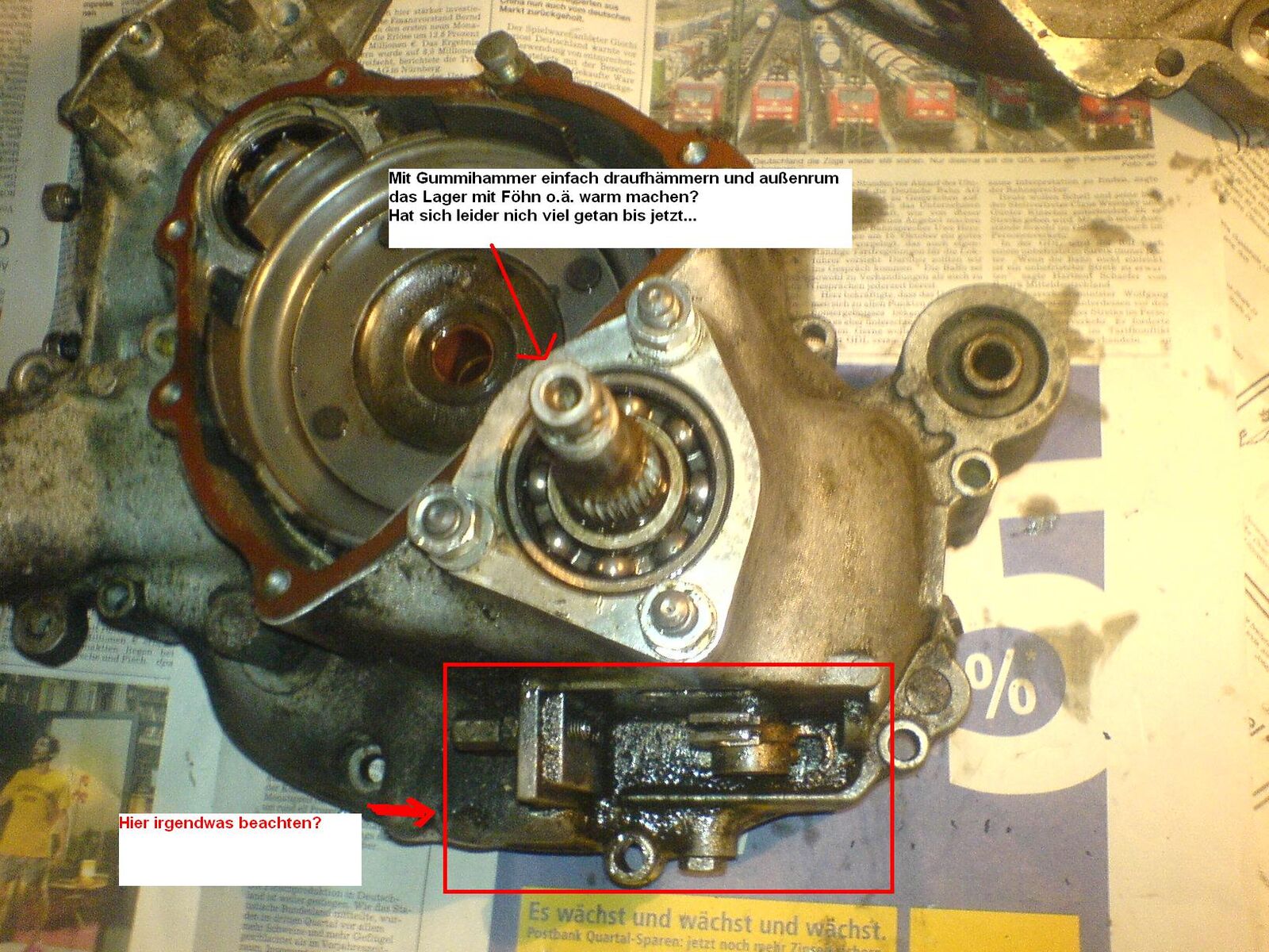 hab einfach solange heißgemacht bis mein heißluftföhn angefangen hat zu schmoren und jetzt hab ich das ganze ding samt kugellager mit 3 schlägen draußen gehabt,