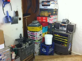 Ist quasi eine 3 geteilte Werkstatt, einmal Rein der Werkraum mit dem ganzen Werkzeugkrempel. Dann hab ich mein Teilelager und nebenan noch den Rollerlagerraum.