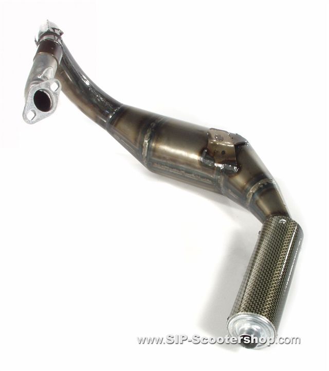 Die Down&Forward Dämpfer kommen schräg unter dem Trittblech heraus, der Dämpfer schaut dabei schräg in Fahrtrichtung, was dem Roller eine spektakuläre Optik gibt. Ideal auf 125cc aufwärts, angenehmer Sound, hohes Drehzahlband. Der Carbon-Kevlar Dämpfer gibt dem Ganzen noch die entsprechende Race-Optik.