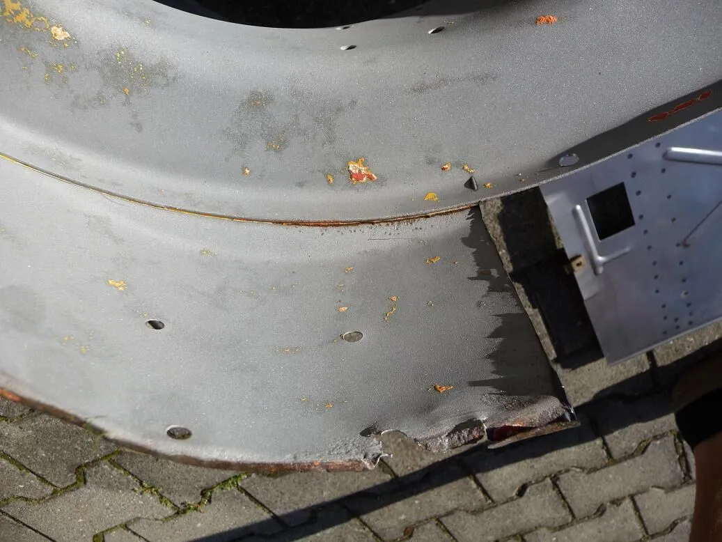 Den Ausschnitt (siehe Bild) musst du dann von deinem alten rausmachen und in`s neue einsetzten. Dann natürlich zwecks länge genau rausmessen und sauber anzeichen bzw. abflexen. Nach dem Straheln siehst du die Schweißpunkte (von unten) ganz gut. Die alle aufbohren (8er Bohrer - notfalls auch mal größer). Die rundungen sind ja bei dir auch nicht mehr gut musst dann ein 0,8mm Stahlblech besorgen und auch gut einpassen. Geht mit dem Hammer ganz gut. Die runte Kante hab ich mit ner modifizierten Grippzange gamacht. Auf die eine Seite ein 10mm Rohr halb aufgeschnitte hingeschweißt auf die andere Seite ein 8mm Rundmaterial. Klappt echt super!