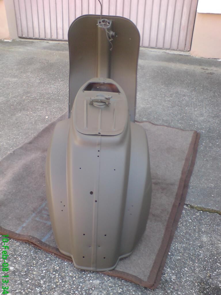 hab alles per hand geschliffen (ca. 8h zusammengerechnet), da man ja durch die ganzen Rundungen leider nirgends mit nem Schwingschleifer oder so rankommt. Originallack habe ich mit 80-120er Körnung angeschliffen, dann Spritzgefillert mit 600er bzw. 800er Nass-Schleifpapier nass glatt geschliffen dann grundiert und lackiert. Mit ein bißchen Übung und Geschick bekommt man sowas schon recht ansehnlich hin. Bei mir ist es nicht so schlimm da es ja eh kein Hochglanz-Roller wird. Anbauteile wie Kaskade, Bremstrommeln usw. werden/sind Mattschwarz. Hab nur noch ein Problem mit dem Sitzbankbolzen, der war mir abgebrochen und konnte ihn leider nicht mittig ausbohren :wacko: ... mal schauen was mir da so einfällt.... ach ja und unterseite hab ich mit überlackierbaren Unterbodenschutz behandelt