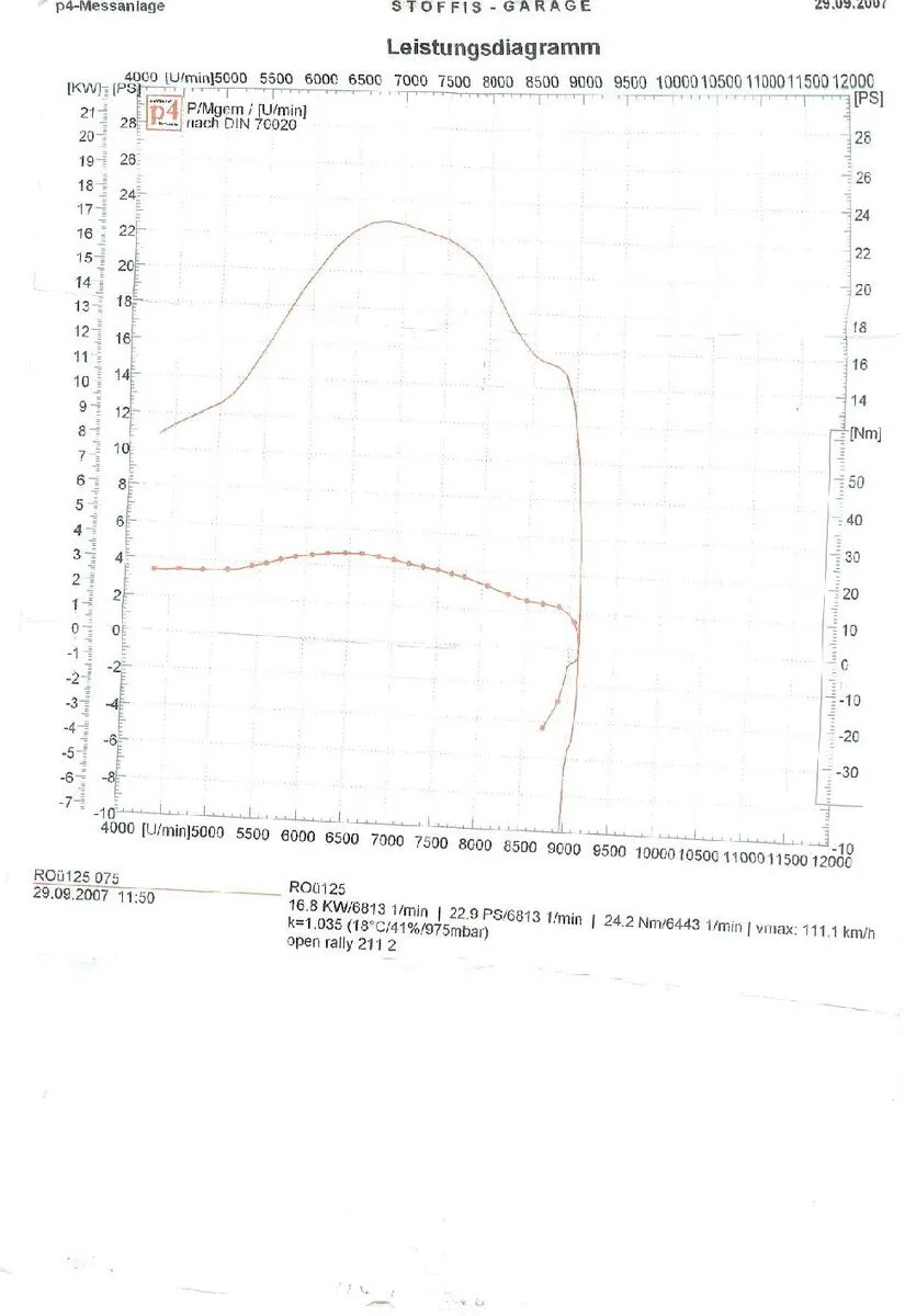 Entscheidend für die Fahrbarkeit ist ein glatter Kurvenverlauf und genug Qualm bei 6000 Umdrehungen (Ganganschluß) hier sollten schlap 20 PS anliegen um einen Erwachsenen die Freude am vierten Gang (200erPrimär) zu bescheren. Die Kurve sollte in Resonanz nicht zu hysterisch ansteigen. Die Pipedesign Kurve liegt da am Limit.