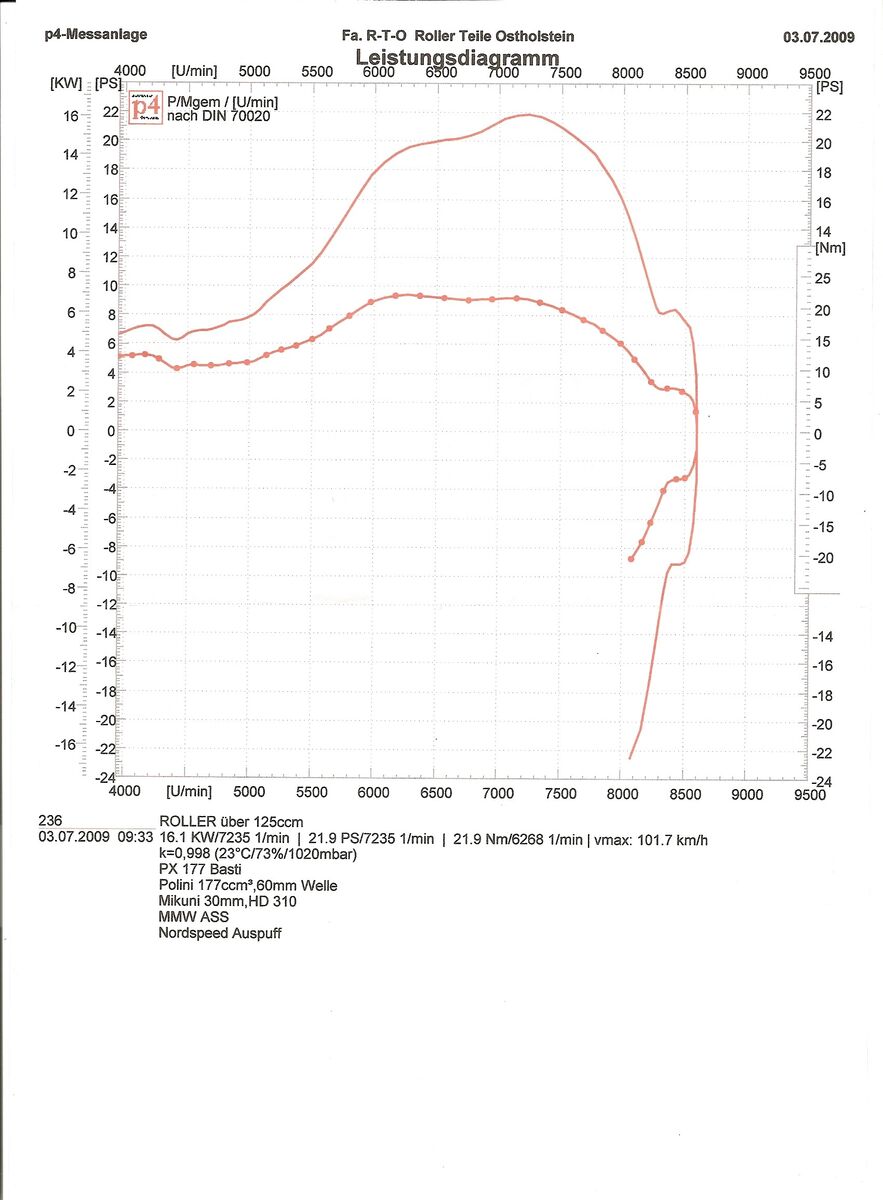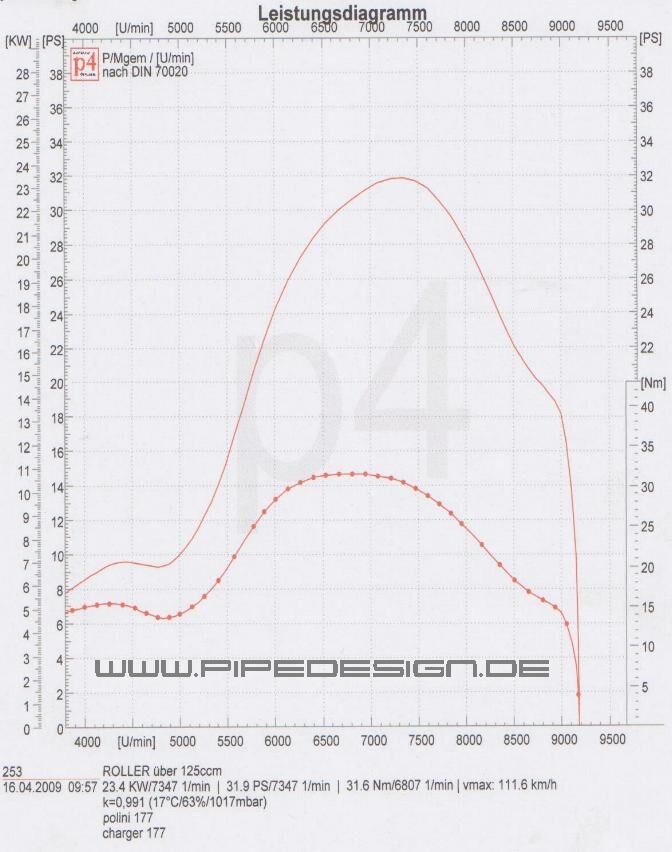 Das Diagramm von Pipedesign ist perfekt und zeigt was der Auspuff kann. Die Spitzenleistung wird nur mit 100 Umdrehungen mehr "erkauft" und liegt 10 PS über Deiner! Der Motor hat einiges an Overrev und dreht nicht unangenehm an die Wand. Sowas macht sich auch bei der Fahrbarkeit bemerkbar. Drehmontverlauf und Leistungsentwicklung sind sehr gut. Es liegen bei 6000 bereits 24 PS an!