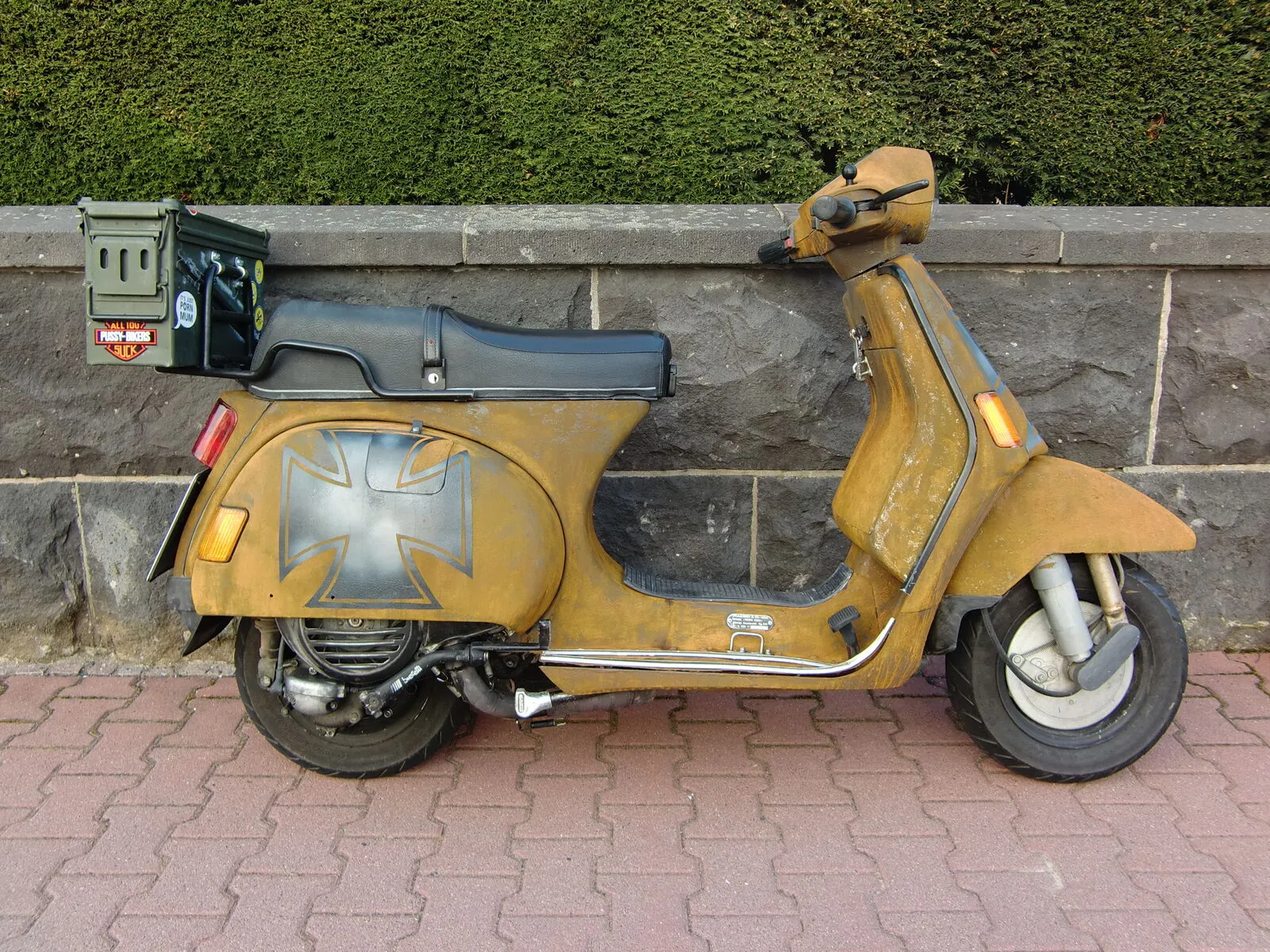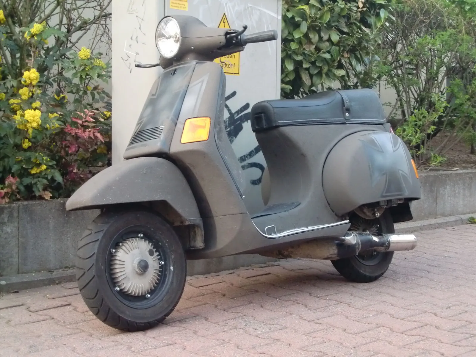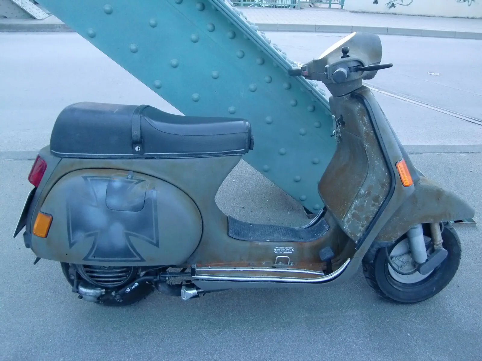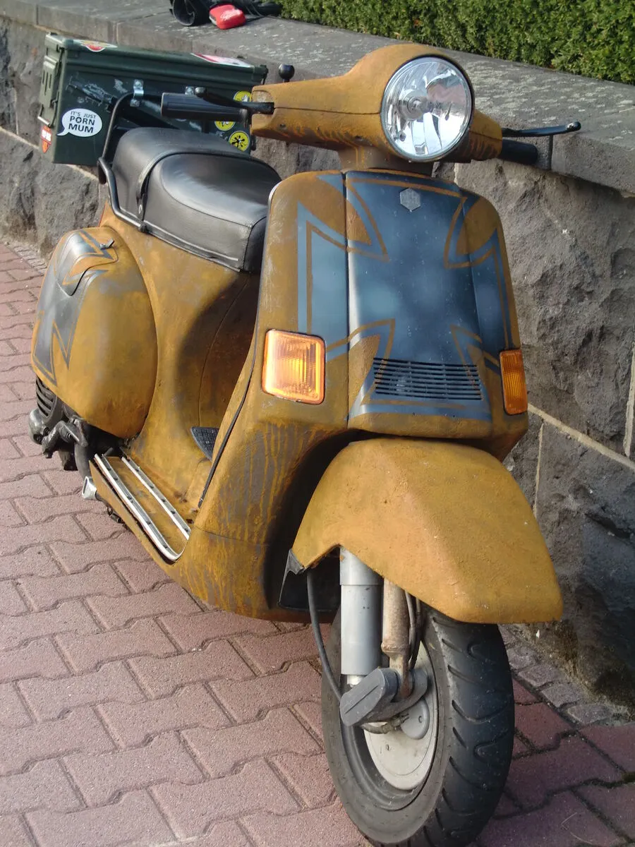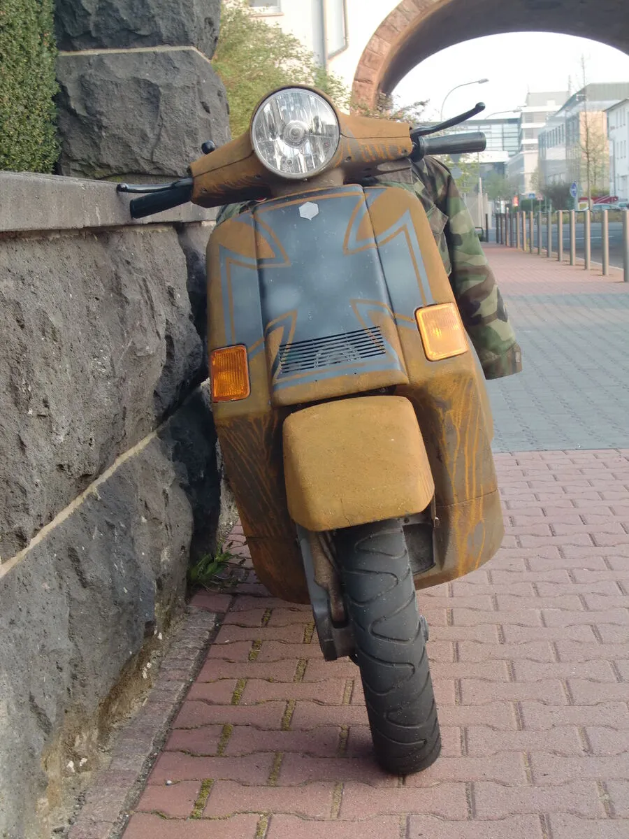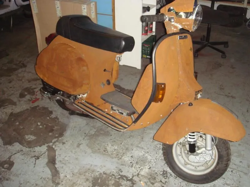 Würde vielleicht aber noch nen T5 Kotflügel oder sogar nen Garelli (mag ich sonst garnicht) dranmachen. Der PX harmoniert irgendwie nicht mit der kurzen Gabel. Sieht aus wie verunfallt.