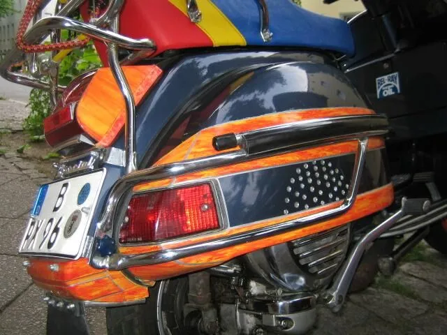 Chromgepäckträger ist abmontiert, die Bohrungen sind durch einen anderen Lufteinlass ergänzt worden, der Lack ist Acryllack, "nass in nass", eigentlich um Beulen und Rost zu überdecken...
