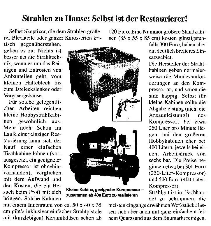 • Lackieren ist damit sicher keine gute Idee, weil kein Ölabscheider vorhanden ist, d. h. die Luft enthält minimale Anteile des Öls, mit dem der Kompressor geschmiert wird. Außerdem sind die Dinger vom Volumen des Kessels her für solche Zwecke viel zu klein. Zum Sand- oder Glasperlstrahlen erst recht, dafür reicht auch der Druck von 8 Bar bei weitem nicht aus. Da könntest du mit ungefähr dem gleichen Effekt auch Sand auf deine Teile schmeißen in der Hoffnung sie so sauber zu bekommen.