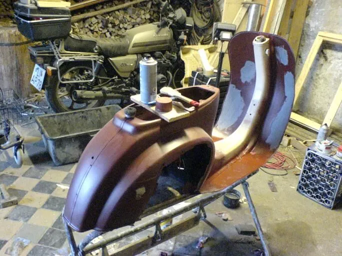 Ich hab ihn mit einem befreundeten Heizungsbauer dann mal komplett zerlegt, und erst mal zum Sandstrahlen gegeben. Danach sah er schon annehmbarer aus. Jetzt haben wir ihn grob verspachtelt, aber mir ist jetzt doch noch was aufgefallen. Diese hässliche Blechwülste