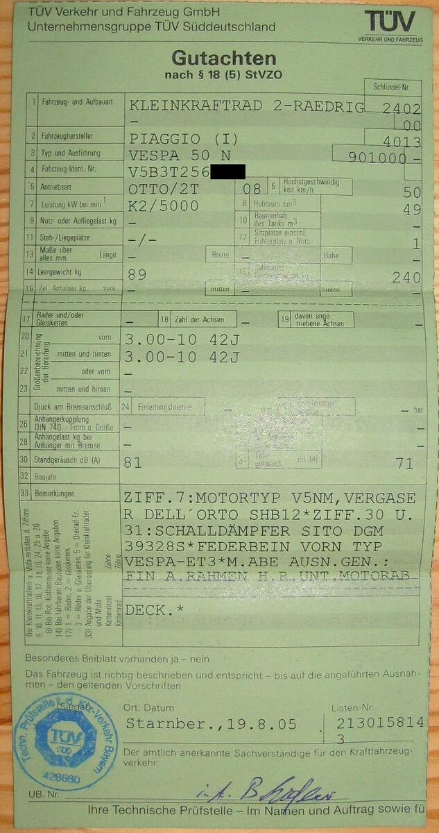 da der tüv keine unterlagen zur hand hatte ausser meine die ich aus den internet habe (von denen der tüv meinte sie seien nicht richtig) will er vergleichsunterlagen oder orginale von piaggio