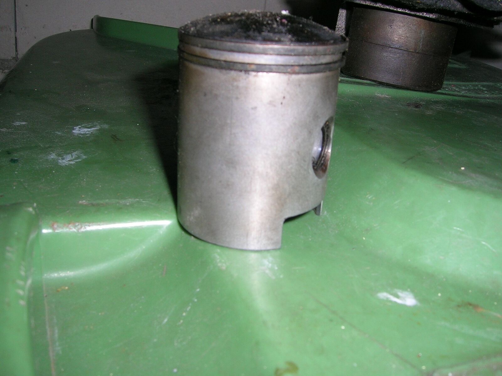der Zylinder sieht schon sehr abgefahren aus, sollte daher gehont + mit Übermaßkolben + neuen Ringen versehen werden, dann kommt wieder ordentlich Leistung und Kompression raus, und man hat Freude daran. Den verschlissenen Zustand sieht man auch am Kolben, der hat auch sehr deutliche Reibspuren, ist bei den Ringen schon "runtergebrannt" (Ringe dichten nicht mehr ganz ab) außerdem unten ausgebrochen. Ein altes Zylinderkit zum neu instandsetzen bekommt man so für 10 € + honen + Übermaßkolben ist man normalerweise dann bei insgesamt 100-120 € Und dann ist das Zylinderkit äußerlich auch nicht neu, aber vom Verschleißzustand einem neuen gleichwertig.