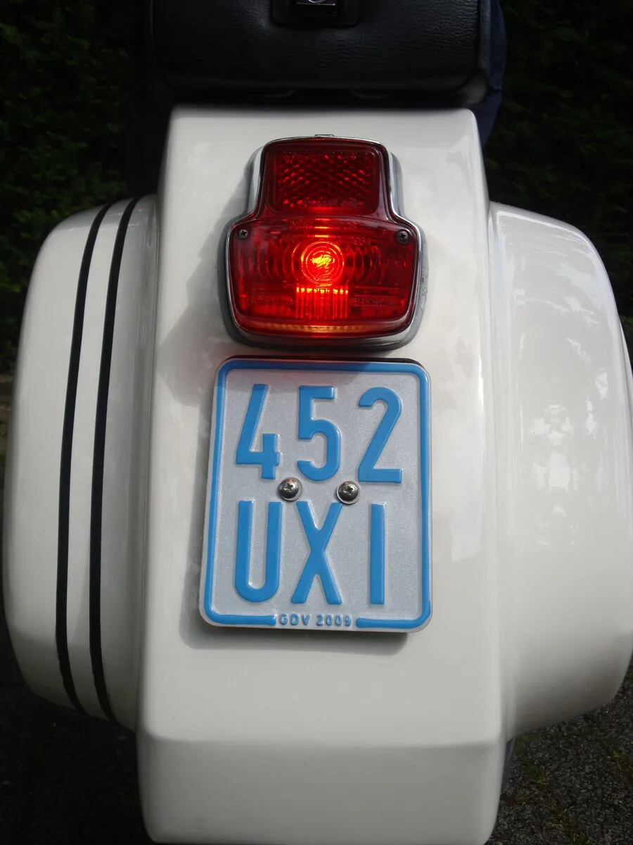 Die Leisten sind aus einem Standard PX Satz "rausgeschnitten" bzw. angepasst. Würd ich aber inzwischen eher mit einem V50 Trittleistensatz machen. Für die viereckigen Löcher im Trittbrett und am Heck habe ich kleine Teile aus Blech eingepasst und dann verschweisst. Könner schweissen die Löcher ohne Zugabe von Blechplättchen zu. Am Heck ist eine LED Heckleuchte. Die beiden Falze am Heck und im Bereich des Benzinhahns wurden verschweisst und verspachtelt.