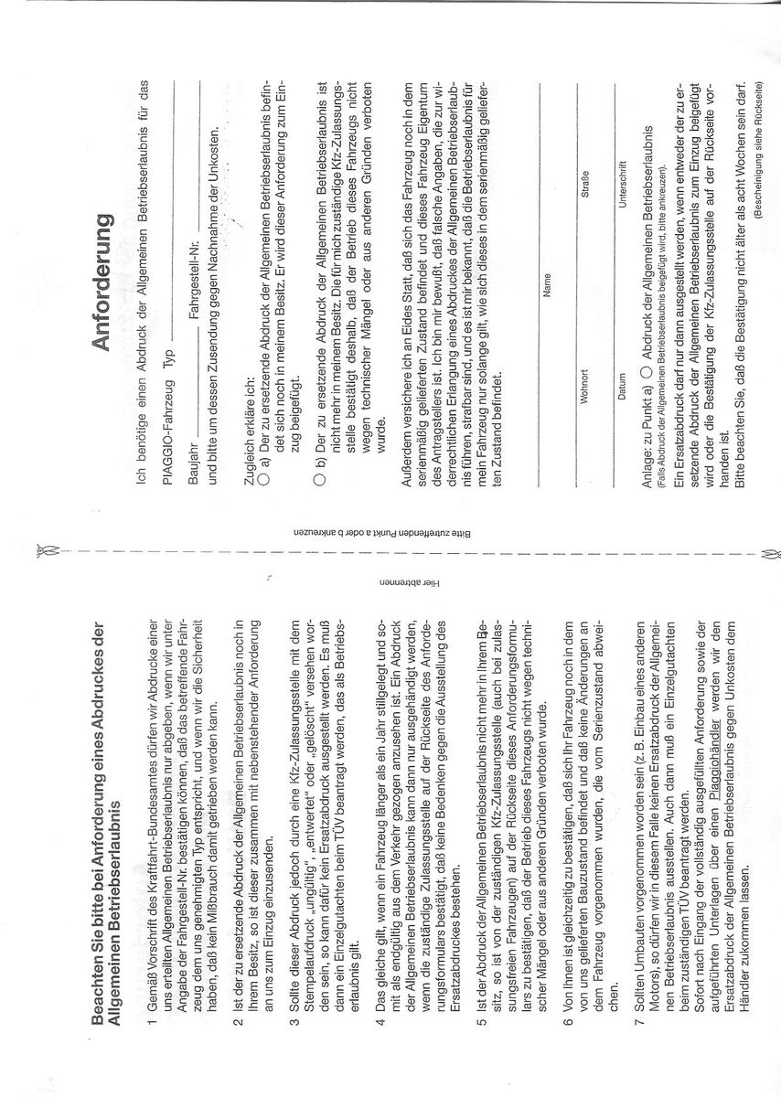 Anhängenden Antrag ausdrucken und ausfüllen. Achtung Piaggio trennt die FIN nach Prefix und Nummer. -