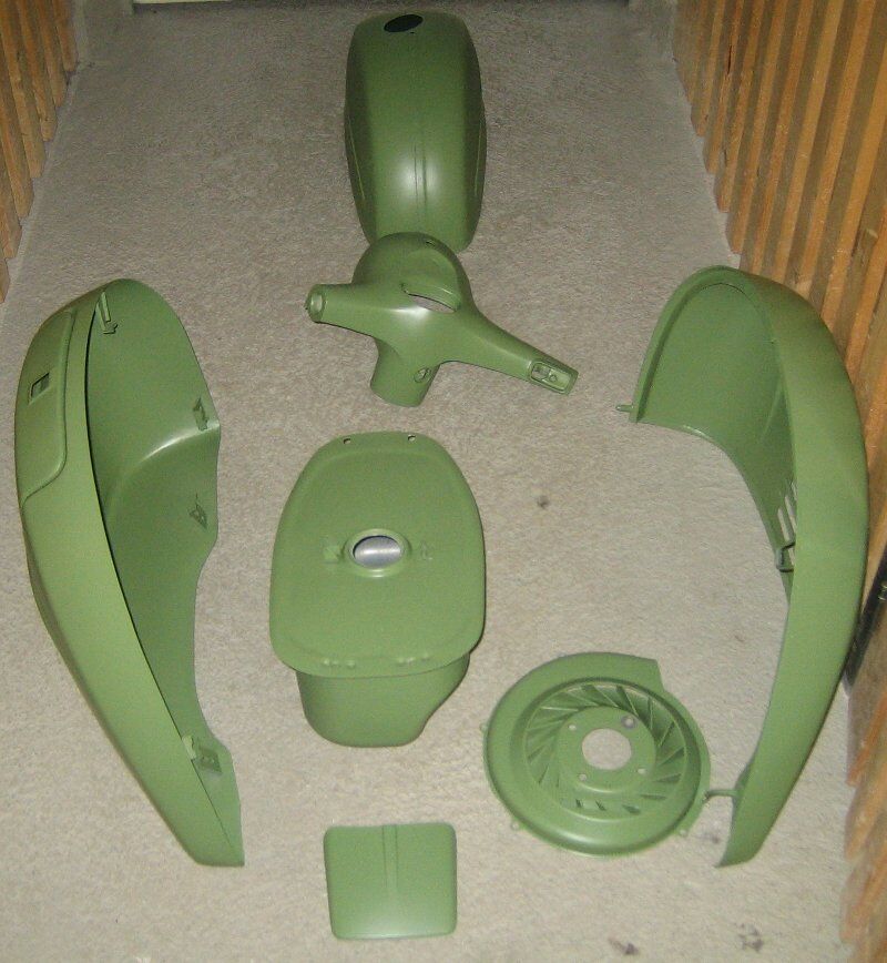 Es geht vorwärts. Habe heute die Anbauteile lackiert retour bekommen. Die Motorabdeckung ist pulverbeschichtet, der Rest RAL 6011 seidenmatt (50% Mattierung).