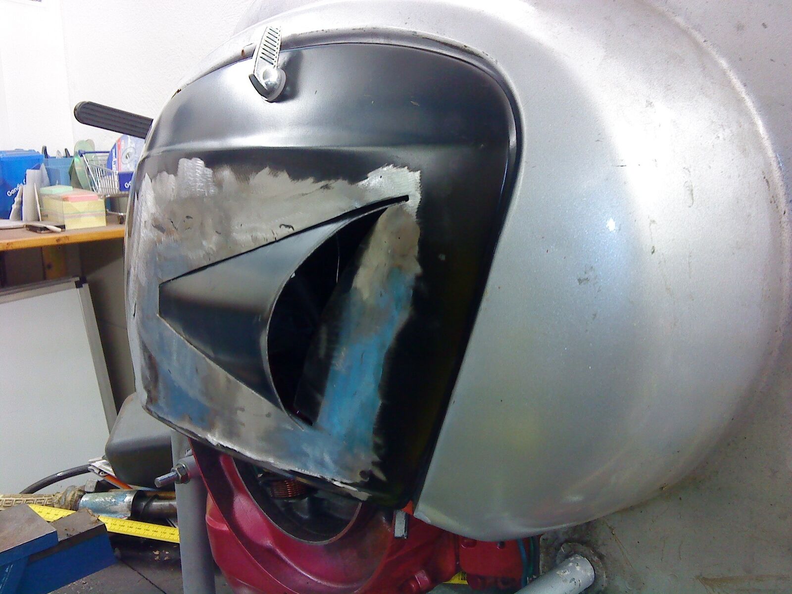 Zuerst wurden die Orgianlen Luftschlitze mit einem Blech verschlossen dann wurde der Lufteinlass ausgeschnitten und angepasst. dann wird och ein Gitter angepasst (hier noch nicht)
