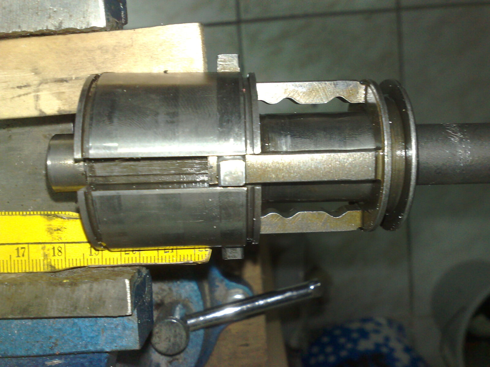 Feder und Kugeln mit dem Zollstock oder was halt in Führung der Antriebswelle reinpasst - in einen Schraubstock unter leichtem Druck einspannen und langsam die Antriebswelle gegen die Schaltklaue einführen. Die beiden enden (z.B Zollstock) noch festhalten bis die klaue über die kugeln ist