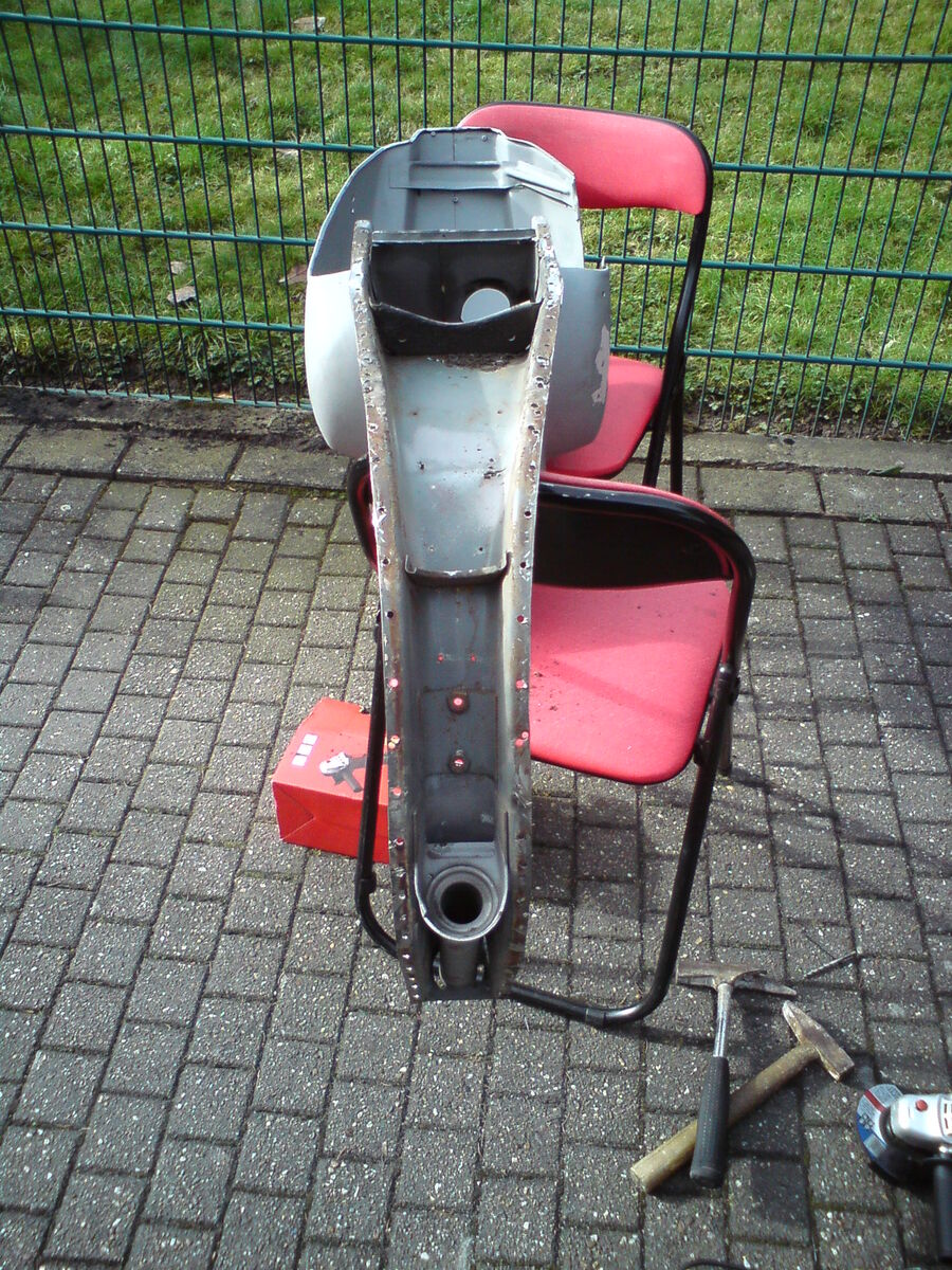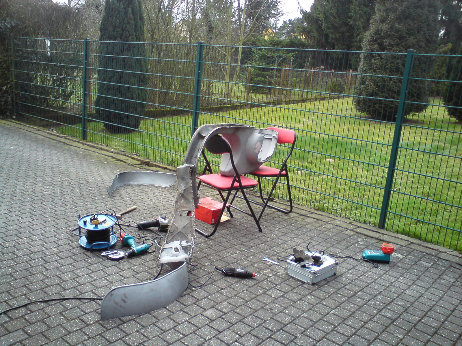 habe alle schweißpunkte aufgebohrt und dann das beinschild mithilfe der flex,hammer und meißel(schraubenzeiher) heraus getrennt...