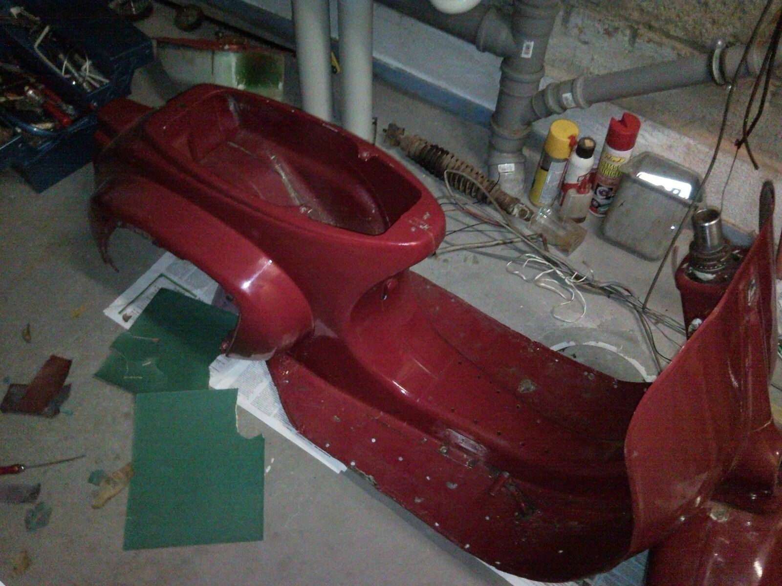 Die Vespa war sehr schlecht und dick überlackiert in einem Dunkelrot und ließ keine Anzeichen auf Durchrostungen oder starke Dellen erkennen.