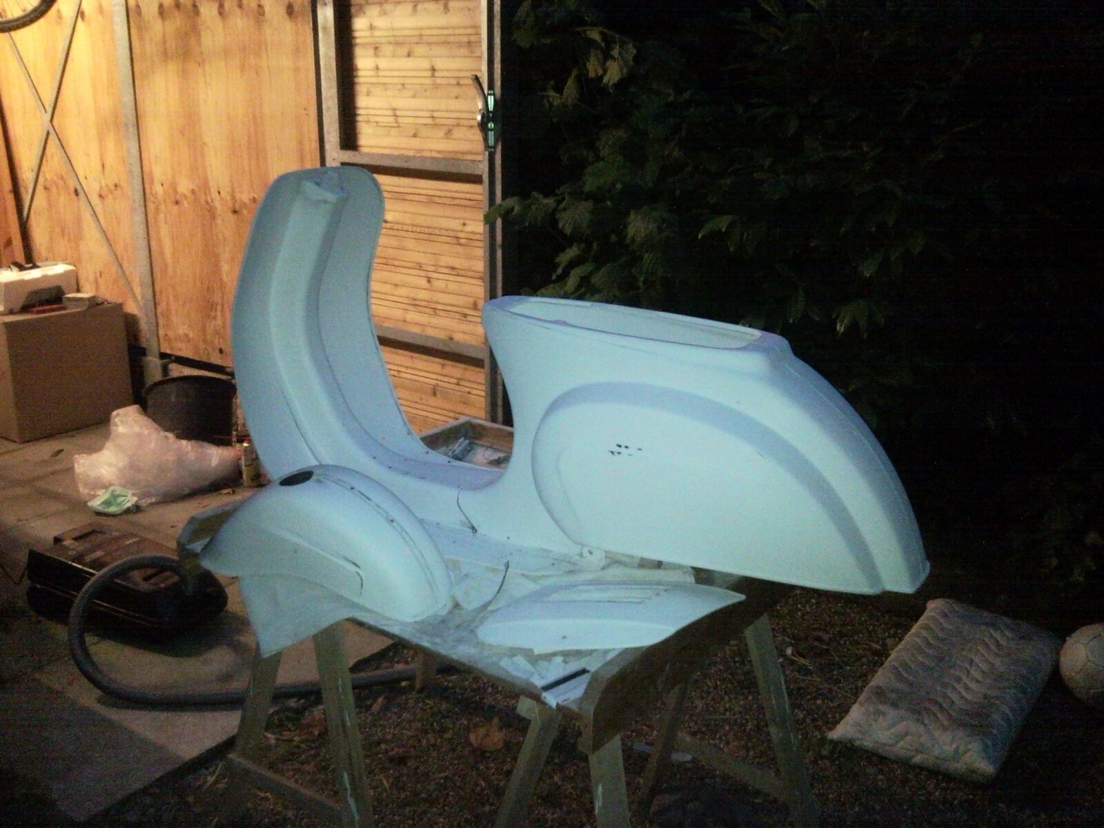 Bin heute mit den ganzen Anbauteilen fertig geworden aber morgen kommt schon wieder die Vespa mit der zweiten Schicht Füller zurück. Die muss ich dann bis Mittwoch Morgen fertig haben.