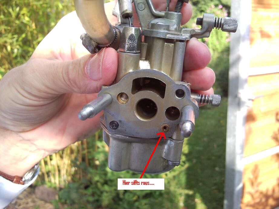 • "Sobald ich den Vergaser auch nur ein bisschen schräg halte fließt aus folgendem Loch Benzin raus"
