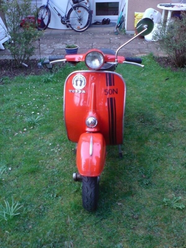 So, seit gestern ist sie da. Eine V50 Rundlicht, Baujahr 1980 (und damit eine der letzten), im netten Originallack. Motor läuft, leuchtet und bremst, allerdings sind sowohl technisch als auch optisch noch ein paar Kleinigkeiten zu erledigen. Hab heute und gestern ein bisschen geputzt, anschließend wird am Wochenende noch poliert und hochglanzversiegelt.