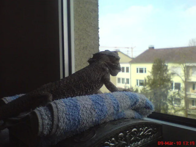Hinzukommt, dasser total unruhig is. Er rennt ständig im Terra durch die Gegend und kratzt an der Scheibe. Wenn ichn dann raushol is ne Weile ruhe bis ihn die Unruhe wieder packt un er durchs Zimmer rennt.