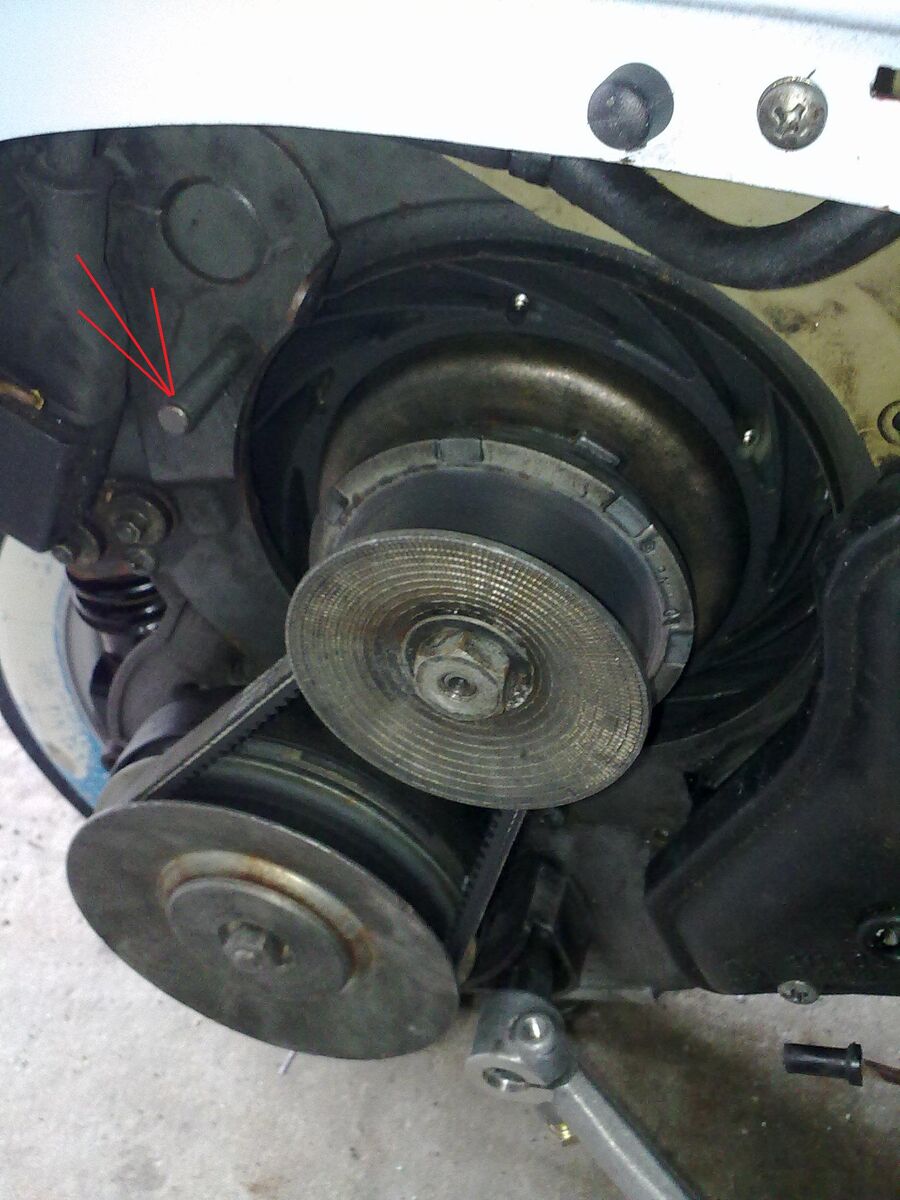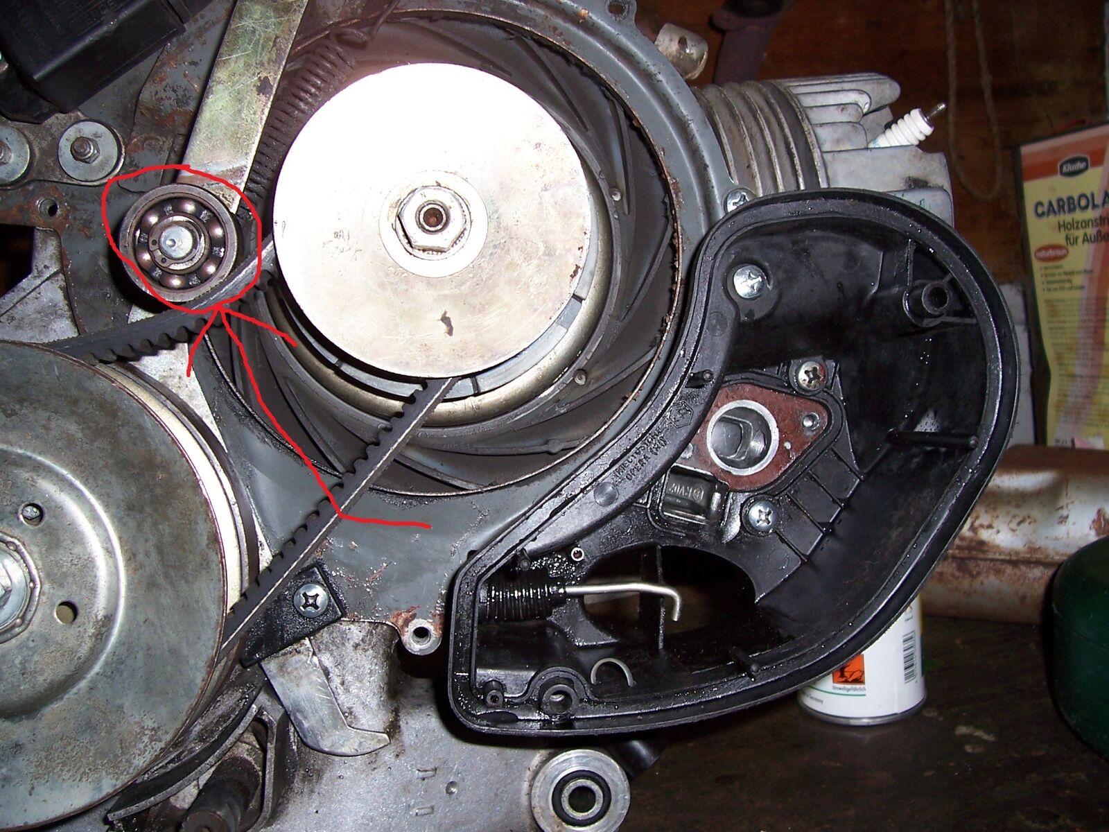 Das Teil hab ich dir auf dem Anhang markiert. Schau einfach mal wenn du kickst, ob sich die untere Riemenscheibe mitdreht und die obere stehen bleibt oder ob sich gar nichts tut.