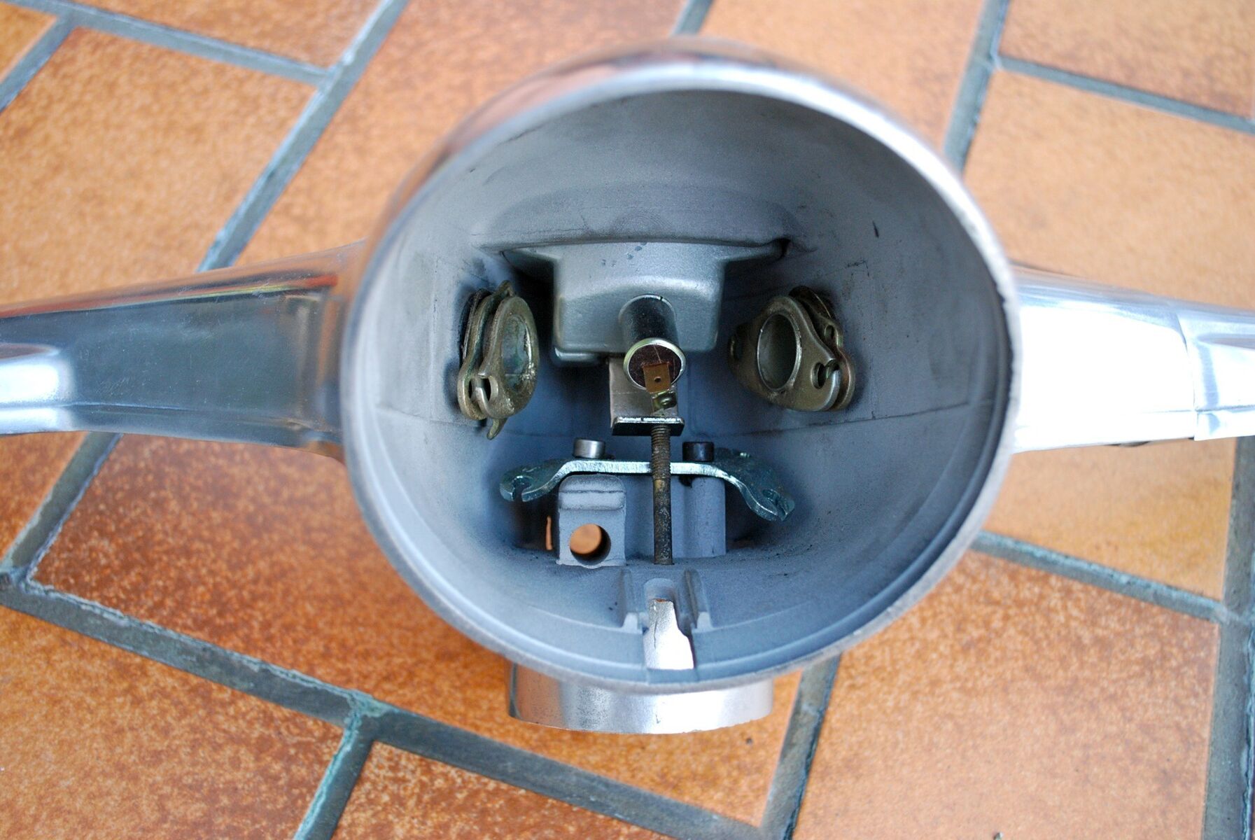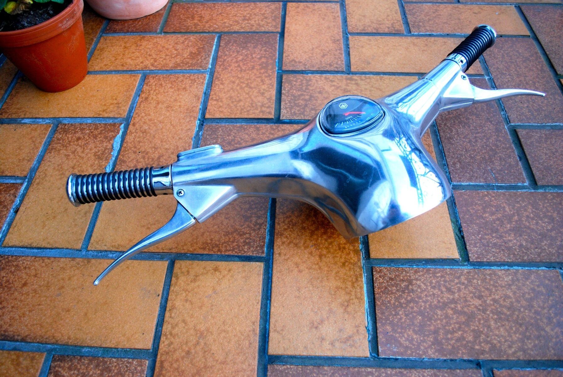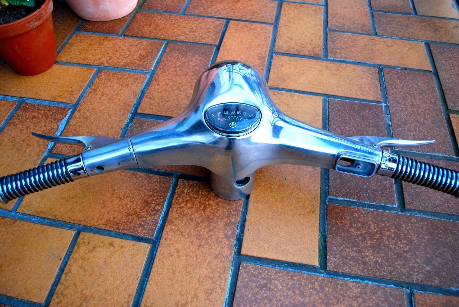 Der Lenkkopf ist absolut intakt und mit allen Innereien. Der Vorbesitzer hat ihn gestrahlt und poliert, sowie Chrom-Griffe befestigt. Ich habe einen neuen Tacho gekauft und eingebaut.