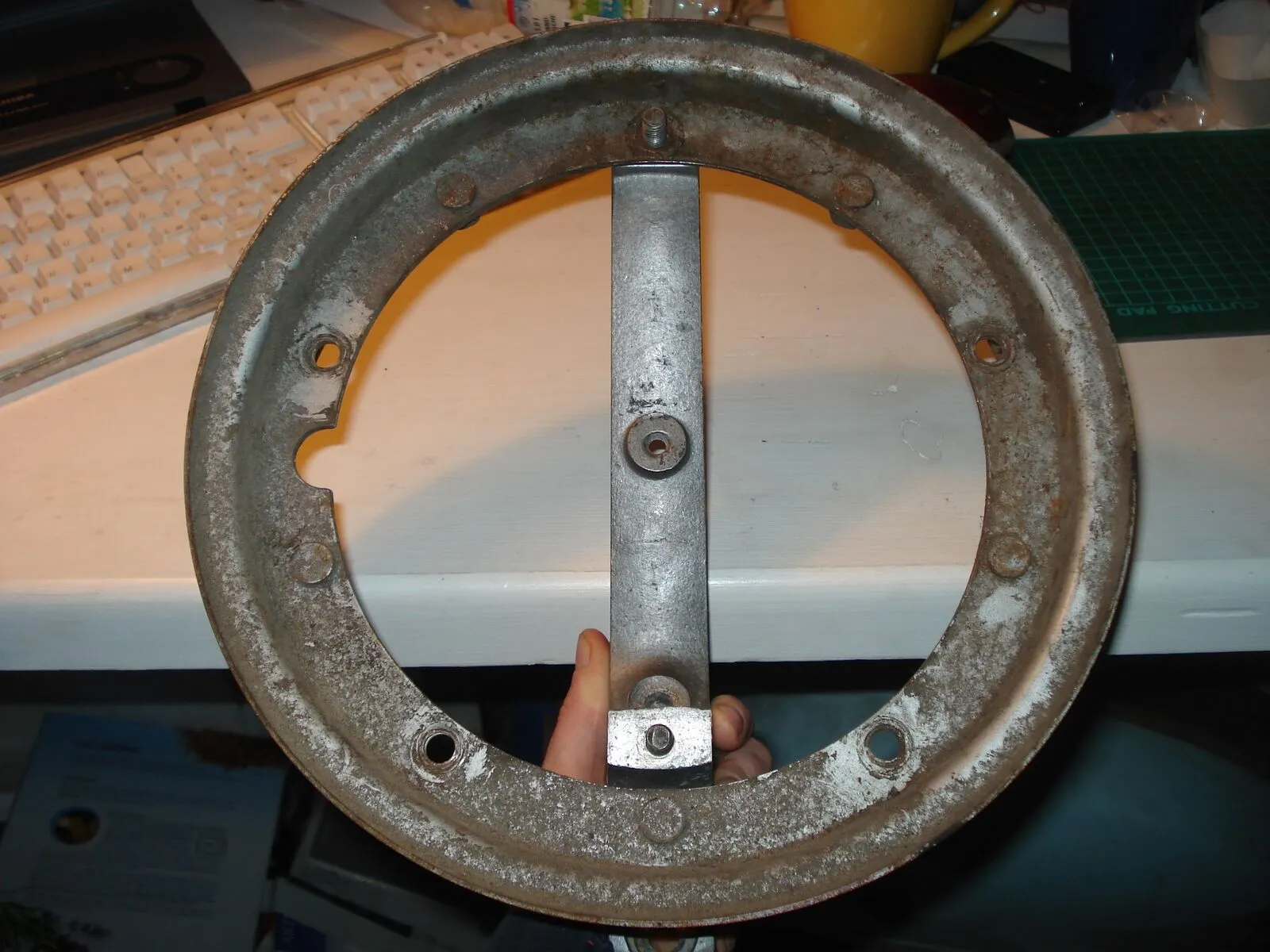 dann isses schon die 4. oder 5. version, da die lasche oben bei den bei sip erhältlichen aufgesteckt wird. das wäre dann der linke. beim rechten kannste ne 9" felge direkt verschrauben, darauf weist auchd as loch in der mitte hin, dort müsste man eine geschlossene felge direkt verschrauben können?!