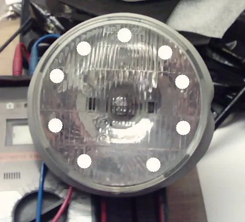 Hi ich habe die Sachen mal proviorisch verlötet. Im Bild 1 oberer Teil, der untere Teil zeigt eine Anordnung von Dioden welche direkt mit Wechselstrom angesteuert werden. Wobei die obere Zeile bei der positiven Halbwelle und die untere bei der negativen Halbwelle leuchtet. Ist aber zu schwach. Im Bild 2 dann eingeschaltet mit ca. 13 Volt, in einem Winken von ca. 20 Grad aufgenommen. Im dritten Bild dann gerade aufgenommen. Man beachte den Unterschied in der Helligkeit. Aus Kostengründen wurde eine LED mit KLEINEM Abstrahlwinkel verwendet. Bei Rück- oder Bremslicht nicht besonders gut. Weiter, hat jemand noch einen defekten Scheinwerfer? ich möchte versuchen ein "Tagfahrlicht" im Scheinwerfer zu installieren wie im letzten Bild.