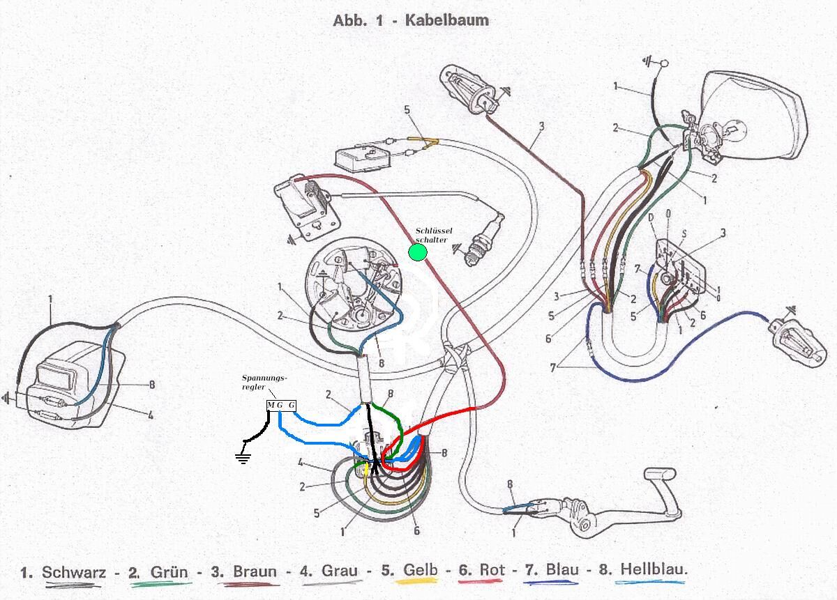 Ergebnis: Lichtschalter EIN, Nix leuchtet ( Blinker gehen auch gar nicht; vermutlich auch durchgebrannt) Aber wenn ich die Bremse drücke leuchtet der Scheinwerfer und das Brems- oder Rücklicht ( untere Birne ??)