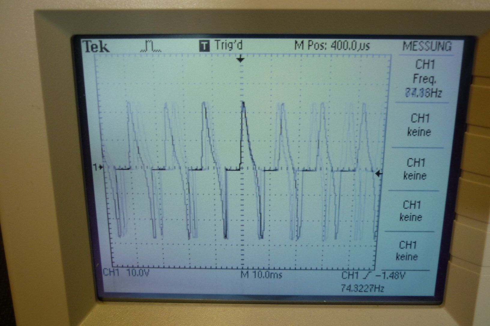 Auch interessant zu sehen. Mein Multimeter zeigt bei der Wechselspannung 9V AC effektiv an. Das Oszilloskop hingegen zeigt eine pulsierende Wechselspannung zwischen +20V und -30V an. Schwer zu erklären, ich hoffe ich kann das Bild vom Oszilloskop noch einstellen! Werd ich morgen erledigen. Meine Nachbarn freuen sich wohl nicht, wenn ich jetzt noch den Knattertoni anschmeiss.