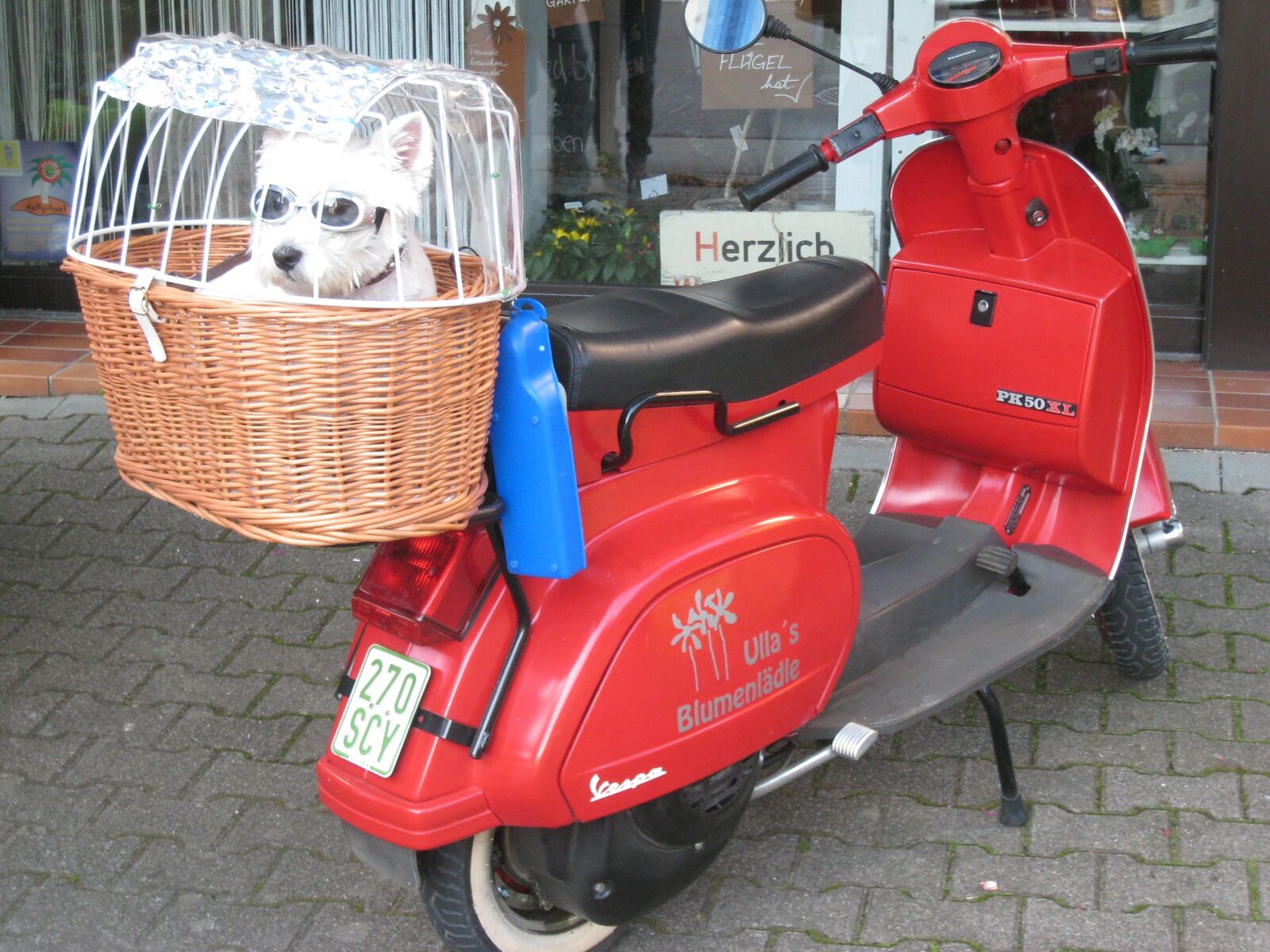 wir transportieren unseren Westi Snoopy stielgerecht auf einer PK 50. Den Korb mit Gitter ober drauf habe ich mit einer Plexiglasplatte aus dem Baumarkt verkleidet, damit es ihm nicht zieht. Obendrauf auf den Gitterkorb habe ich eine dicke Alufolie gegen die Sonne befestigt. Snoopy findet vespafahren voll Klasse u. ist immer der Erste an Bord. Und wenn wir schnell unterwegs sind kriegt er ne Racerbrille auf.
